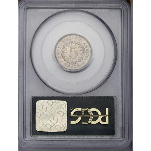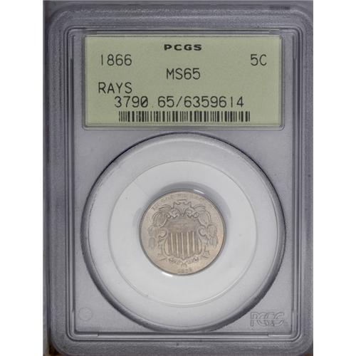 <B>1866<5C> Rays MS65 PCGS.</B></I> What a logistical nightmare it must have been for Mint employees to crank out more than 14 million examples of this complicated design in an extremely hard, newly introduced composition. The Gem example offered here, one of relatively few considering its first year status and high production, shows the Rays design near its very best. The design elements are frosty and well executed, being expectantly soft on a few of the stars and rays surrounding the numeral 5. Small die cracks below several of the letters in CENTS give an indication of the stress involved in striking such a coin. Delicate golden patina glances across both sides, but overall the coin presents as brilliant. <BR><BR><B>Important notice:</B> Heritage usually auctions material at the rate of 200-250 lots per hour. On some occasions eBay Live bid software or the Internet may not be able to keep up with the pace of the auction. We recommend placing a realistic absentee bid now as insurance to avoid disappointment. Occasionally the auctioneer may eliminate or reject an eBay Live bid, and the auctioneer may also reopen a lot after the close of the eBay live bidding (usually because we missed an audience bid), and may reject your bid even if it shows you as the winning bidder. By bidding via eBay Live, you agree that Heritage may award the lot to another bidder at its sole discretion under the circumstances described above or any other reasonable circumstances. Since eBay bids are not shown to us until we open the lot on the floor, we treat those bids just like floor bids. In most cases the floor responds before the eBay bid is presented to us, due to Internet lag time, so for consistency we have made it a policy that floor bids are always considered first over tie eBay live bids. Also please note that all Heritage lots purchased through eBay Live carry a 20% Buyer's Premium. Please make sure you read the Terms and Conditions before you bid. This lot is being auctioned in conjunction with a live floor auction by Heritage Galleries & Auctioneers. All final auction and invoice information will be supplied by Heritage Galleries & Auctioneers, and all other information should be considered preliminary. Lot:843 <BR><BR><B>Winning Notification and Billing:</B> After the FINAL session in this auction is complete, Heritage will send e-mail and snail mail invoices. This process normally takes several days. All final auction and invoice information will be supplied by Heritage Galleries & Auctioneers, and all other information should be considered preliminary. <BR><BR>This auction will be conducted on a live auction floor and over the Internet through eBay Live. If you choose to place an absentee bid, please take a moment to <font color='#0000ff'><u><a href='http://pages.ebay.com/liveauctions/help/before/laabsentee.html'>learn how eBay Live absentee bidding works</a></u></font><font color='#000000'>