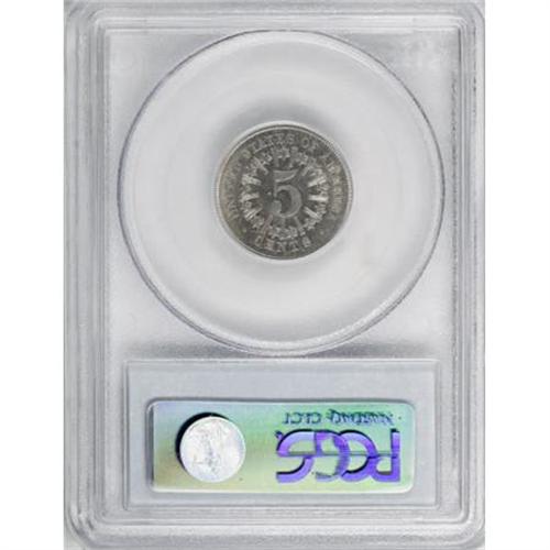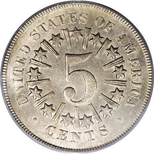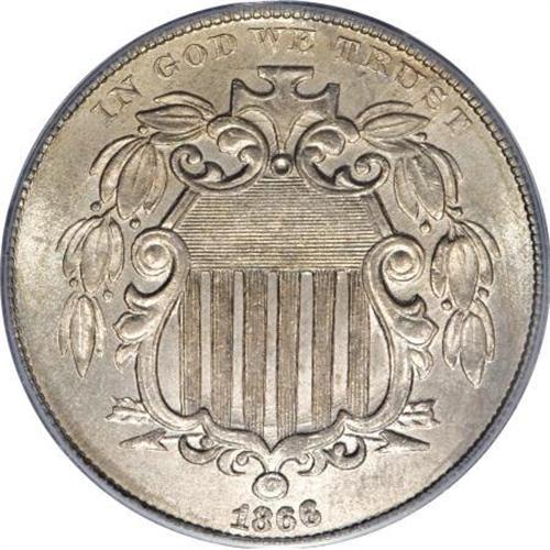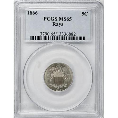 <B>1866 5C Rays MS65 PCGS.</B></I> A thin layer of golden patina appears over the steel-gray surfaces, which boast considerable mint luster. Some small die cracks are noted on the reverse through the denomination, indicative of die fatigue, and some of the stars on that side are bluntly struck. Seldom seen in a finer grade: PCGS has certified only 28 finer of this popular type coin (12/07).<BR><BR><B>Coin Engraver:</B> James B. Longacre<BR><BR><b>Shipping:</b> Coins & Currency (<a target="_blank" href="http://www.heritageauctions.com/common/shipping.php">view shipping information</a>)