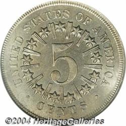 <table><tr><td><table><tr><td>1866 5C Rays MS66 NGC. Always popular as the first year of issue for the denomination, the surfaces are lightly toned with streaky gray patina and well balanced from one side to the other. The obverse and reverse dies appear to be mismatched, though, as the obverse is fully defined and shows no die cracks, while the reverse has just a bit of striking softness on the stars and a couple of short die cracks. Satiny mint luster. Population: 16 in 66, 0 finer (3/04). <BR><BR><B>Important notice:</B> Heritage usually auctions material at the rate of 200-250 lots per hour. On some occasions eBay Live bid software or the Internet may not be able to keep up with the pace of the auction. We recommend placing a realistic absentee bid now as insurance to avoid disappointment. Occasionally the auctioneer may eliminate or reject an eBay Live bid, and the auctioneer may also reopen a lot after the close of the eBay live bidding (usually because we missed an audience bid), and may reject your bid even if it shows you as the winning bidder. By bidding via eBay Live, you agree that Heritage may award the lot to another bidder at its sole discretion under the circumstances described above or any other reasonable circumstances. Since eBay bids are not shown to us until we open the lot on the floor, we treat those bids just like floor bids. In most cases the floor responds before the eBay bid is presented to us, due to Internet lag time, so for consistency we have made it a policy that floor bids are always considered first over tie eBay live bids. Also please note that all Heritage lots purchased through eBay Live carry a 20% Buyer's Premium. Please make sure you read the Terms and Conditions before you bid. <BR><BR><B>IMPORTANT ANNOUNCEMENT ABOUT RESERVES:</B> Heritage now divulges all reserves on its web site 7 days before every auction. If you want to know whether the reserve on this lot has been met, and if not, what the reserve amount is, please visit this lot page on the HeritageCoin.com web site, or email: bid@HeritageGalleries.com </span></font></td></tr></table></td></tr></table>