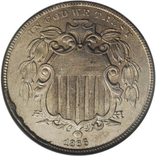 <B>1866 5C Rays MS66 NGC.</B></I> This lustrous high grade piece is attractively toned in delicate silver-blue and tan-gold shades. The Mint's difficulties with the nickel alloy are apparent on many examples of this first-year issue. The dies were unable to stand up to the pressure of striking the hard planchets. On the present piece, there is a lengthy obverse rim die break between 7 and 9 o'clock. Still, the design elements exhibit sharper-than-average definition. There are no mentionable marks or spots to report. Census: 19 in 66, 0 finer (4/07).<BR><BR><b>Shipping:</b> Coins & Currency (<a target="_blank" href="http://www.heritageauctions.com/common/shipping.php">view shipping information</a>)