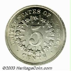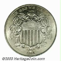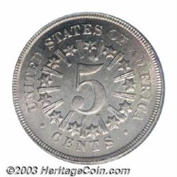 <table><tr><td><TABLE cellSpacing=0 cellPadding=0 width="100%" bgColor=#000000 border=0><TBODY> <TR><TD width="100%"><TABLE cellSpacing=1 cellPadding=3 width="100%" border=0><TBODY><TR><TD width="100%" bgColor=#79735c><FONT face=arial color=#ffffff size=3><B>Description</B> </FONT></TD></TR><TR><TD width="100%" bgColor=#ffffff><FONT face=arial size=2><B>1866 5C Rays MS66 PCGS.</B></I> A brilliant and lustrous Gem with a bold strike and impressive preservation. The upper and lower obverse rims display multiple die cracks, as struck, while the reverse has wispy die cracks throughout the peripheral legends. Slender die striations (as made) reside beneath the left vertical shield lines, and bisect the reverse. This first-year issue was plagued by striking problems, leading to the removal of the rays between the stars, on the reverse. Some striking irregularity in this region is seen on the current example, but, along with the previously mentioned "as struck" features, this does not affect the coin's technical grade. Therefore, we rely on luster (excellent), surface preservation (nearly flawless), and overall eye appeal (splendid), to determine the premium quality status of this conditionally scarce example. Population: 17 in 66, 0 finer (4/03). </FONT></TD></TR></TBODY></TABLE></TD></TR></TBODY></TABLE><BR><A name=PricesRealized></A><TABLE cellSpacing=0 cellPadding=0 width="100%" bgColor=#000000 border=0><TBODY><TR><TD width="100%"><TABLE cellSpacing=1 cellPadding=3 width="100%" border=0><TBODY><TR><TD width="100%" bgColor=#79735c><A name=PR><FONT face=arial color=#ffffff size=3><B>Previous Prices from Heritage Auctions</B> </FONT></A></TD></TR><TR><TD bgColor=#f6f6ed><TABLE cellSpacing=0 cellPadding=0 width="100%" border=1><TBODY><TR><TD align=middle width="33%"><B>Date</B></TD><TD align=middle width="33%"><B>Service</B></TD><TD align=middle width="33%"><B>Price</B></TD></TR><TR bgColor=whitesmoke><TD width="33%"><B>03/25/2003</B></TD><TD width="33%">NGC</TD><TD width="33%">$3,335.00</TD></TR><TR bgColor=whitesmoke><TD width="33%"><B>09/20/2003</B></TD><TD width="33%">PCGS</TD><TD width="33%">$4,600.00</TD></TR><TR bgColor=whitesmoke><TD width="33%"><B>07/29/2003</B></TD><TD width="33%">PCGS</TD><TD width="33%">$5,290.00</TD></TR><TR bgColor=whitesmoke><TD width="33%"><B>01/11/2003</B></TD><TD width="33%">NGC</TD><TD width="33%">$3,105.00</TD></TR><TR bgColor=whitesmoke><TD width="33%"><B>04/27/2002</B></TD><TD width="33%">PCGS</TD><TD width="33%">$5,290.00</TD></TR><TR bgColor=whitesmoke><TD width="33%"><B>08/08/2001</B></TD><TD width="33%">NGC</TD><TD width="33%">$3,795.00</TD></TR><TR bgColor=whitesmoke><TD width="33%"><B>05/31/2001</B></TD><TD width="33%">PCGS</TD><TD width="33%">$5,635.00</TD></TR><TR bgColor=whitesmoke><TD width="33%"><B>06/05/1999</B></TD><TD width="33%">PCGS</TD><TD width="33%">$5,734.30</TD></TR><TR bgColor=whitesmoke><TD width="33%"><B>10/26/2000</B></TD><TD width="33%">PCGS</TD><TD width="33%">$5,405.00</TD></TR><TR bgColor=whitesmoke><TD width="33%"><B>05/01/1998</B></TD><TD width="33%">PCGS</TD><TD width="33%">$5,060.00</TD></TR><TR bgColor=whitesmoke><TD width="33%"><B>05/01/1998</B></TD><TD width="33%">PCGS</TD><TD width="33%">$5,060.00</TD></TR><TR bgColor=whitesmoke><TD width="33%"><B>08/01/1998</B></TD><TD width="33%">NGC</TD><TD width="33%">$5,750.00</TD></TR><TR bgColor=whitesmoke><TD width="33%"><B>02/01/1997</B></TD><TD width="33%">PCGS</TD><TD width="33%">$4,950.00</TD></TR></TBODY></TABLE></TD></TR><TR><TD bgColor=#ffffff><FONT face=arial size=1 ?>PLEASE NOTE: All prices realized reflect the final hammer price PLUS the buyer's premium in auctions that charge a buyer's premium. Each item has a notation at the top of the listing indicating whether that lot included a buyer's premium. Example: A item that sells with a final hammer price of $100 and a 20% buyer's premium will display with a price realized of $120. All information listed is intended to be as accurate as possible, but errors are possible. Please use this guide carefully and inform us of any inaccuracies. </FONT></TD></TR></TBODY></TABLE></TD></TR></TBODY></TABLE><BR><TABLE cellSpacing=0 cellPadding=0 width="100%" bgColor=#000000 border=0><TBODY><TR><TD width="100%"><TABLE cellSpacing=1 cellPadding=3 width="100%" border=0><TBODY><TR><TD width="100%" bgColor=#79735c colSpan=6><FONT face=arial color=#ffffff size=3><B>Price Guide*</B> </FONT></TD></TR><TR bgColor=#f6f6ed><TD align=middle><B>Grade</B> </TD><TD align=middle><B>Coin World<BR>(Trends)</B> </TD><TD align=middle><B>Numismedia<BR>Retail</B> </TD><TD align=middle><B>Numismedia<BR>Wholesale</B> </TD><TD align=middle><B>Coin<BR>Universe</B> </TD><TD align=middle><B>Heritage<BR>Value Index</B> </TD></TR><TR bgColor=#ffffff><TD align=middle>65</TD><TD align=right>$2,500.00</TD><TD align=right>---</TD><TD align=right>$1,850.00</TD><TD align=right>$2,850.00</TD><TD align=right>$1,900.00</TD></TR><TR style="FONT-WEIGHT: bold" bgColor=#cccfdd><TD align=middle>66</TD><TD align=right>$6,000.00</TD><TD align=right>---</TD><TD align=right>$5,450.00</TD><TD align=right>$7,500.00</TD><TD align=right>---</TD></TR><TR bgColor=#ffffff><TD align=middle>67</TD><TD align=right>---</TD><TD align=right>---</TD><TD align=right>---</TD><TD align=right>---</TD><TD align=right>---</TD></TR><TR bgColor=#ffffff><TD colSpan=6><FONT size=1>*All information listed is intended to be as accurate as possible, but errors are possible. No item may be returned or refused based on this information which is provided as a service to our customers. You should contact each pricing source directly to determine the accuracy of this information. </FONT></TD></TR></TBODY></TABLE></TD></TR></TBODY></TABLE><BR><TABLE cellSpacing=0 cellPadding=0 width="100%" bgColor=#000000 border=0><TBODY><TR><TD width="100%"><TABLE cellSpacing=1 cellPadding=3 width="100%" border=0><TBODY><TR><TD width="100%" bgColor=#79735c><FONT face=arial color=#ffffff size=3><B>Population Guide</B> </FONT></TD>