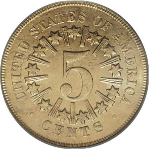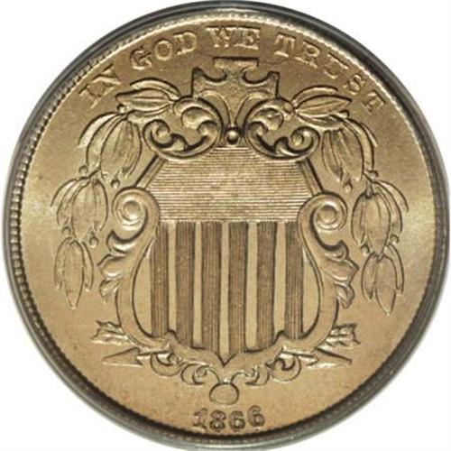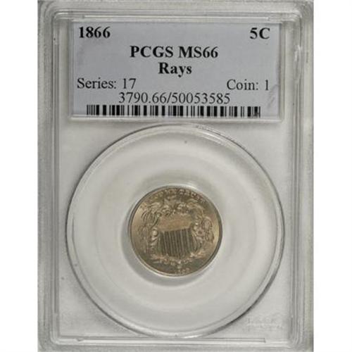 <B>1866 5C Rays MS66 PCGS.</B></I> Impressive cartwheel sheen and dusky caramel-gold toning confirm the originality of this unabraded and typically struck Premium Gem. A scarce type coin in such lofty grade, since the Rays design was used for only the initial two years of the nickel five cent piece. Population: 28 in 66, 0 finer (7/07).<BR><BR><B>Coin Engraver:</B> James B. Longacre<BR><BR><b>Shipping:</b> Coins & Currency (<a target="_blank" href="http://www.heritageauctions.com/common/shipping.php">view shipping information</a>)