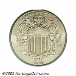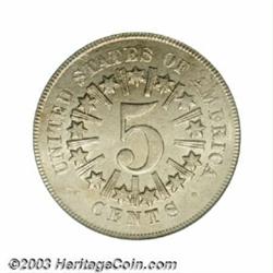 <TR><TD width="100%"><TABLE cellSpacing=1 cellPadding=3 width="100%" border=0><TBODY><TR><TD width="100%" bgColor=#79735c><FONT face=arial color=#ffffff size=3><B>Description</B> </FONT></TD></TR><TR><TD width="100%" bgColor=#ffffff><FONT face=arial size=2><B>1866 5C Rays MS66 PCGS.</B></I> This example is seemingly mark-free and brilliant, with thick mint frost. The somewhat irregular striking details are characteristic of nickels struck in this first year of production for the denomination. The vertical shield lines and the stars are ill-defined, as usual. Multiple die cracks (as struck) reside near the peripheries on each side, and a small planchet flaw (also as struck) rests near 8 o'clock on the left reverse rim. An immaculate coin and quite a rarity as a business strike and in this lofty condition. Population: 17 in 66, 0 finer (4/03). </FONT></TD></TR></TBODY></TABLE></TD></TR></TBODY></TABLE><BR><A name=PricesRealized></A><TABLE cellSpacing=0 cellPadding=0 width="100%" bgColor=#000000 border=0><TBODY><TR><TD width="100%"><TABLE cellSpacing=1 cellPadding=3 width="100%" border=0><TBODY><TR><TD width="100%" bgColor=#79735c><A name=PR><FONT face=arial color=#ffffff size=3><B>Previous Prices from Heritage Auctions</B> </FONT></A></TD></TR><TR><TD bgColor=#f6f6ed><TABLE cellSpacing=0 cellPadding=0 width="100%" border=1><TBODY><TR><TD align=middle width="33%"><B>Date</B></TD><TD align=middle width="33%"><B>Service</B></TD><TD align=middle width="33%"><B>Price</B></TD></TR><TR bgColor=whitesmoke><TD width="33%"><B>10/26/2000</B></TD><TD width="33%">PCGS</TD><TD width="33%">$5,405.00</TD></TR><TR bgColor=whitesmoke><TD width="33%"><B>04/27/2002</B></TD><TD width="33%">PCGS</TD><TD width="33%">$5,290.00</TD></TR><TR bgColor=whitesmoke><TD width="33%"><B>05/31/2001</B></TD><TD width="33%">PCGS</TD><TD width="33%">$5,635.00</TD></TR><TR bgColor=whitesmoke><TD width="33%"><B>05/01/1998</B></TD><TD width="33%">PCGS</TD><TD width="33%">$5,060.00</TD></TR><TR bgColor=whitesmoke><TD width="33%"><B>06/05/1999</B></TD><TD width="33%">PCGS</TD><TD width="33%">$5,734.30</TD></TR><TR bgColor=whitesmoke><TD width="33%"><B>05/01/1998</B></TD><TD width="33%">PCGS</TD><TD width="33%">$5,060.00</TD></TR><TR bgColor=whitesmoke><TD width="33%"><B>02/01/1997</B></TD><TD width="33%">PCGS</TD><TD width="33%">$4,950.00</TD></TR><TR bgColor=whitesmoke><TD width="33%"><B>01/11/2003</B></TD><TD width="33%">NGC</TD><TD width="33%">$3,105.00</TD></TR><TR bgColor=whitesmoke><TD width="33%"><B>08/08/2001</B></TD><TD width="33%">NGC</TD><TD width="33%">$3,795.00</TD></TR><TR bgColor=whitesmoke><TD width="33%"><B>08/01/1998</B></TD><TD width="33%">NGC</TD><TD width="33%">$5,750.00</TD></TR><TR bgColor=whitesmoke><TD width="33%"><B>03/25/2003</B></TD><TD width="33%">NGC</TD><TD width="33%">$3,335.00</TD></TR></TBODY></TABLE></TD></TR><TR><TD bgColor=#ffffff><FONT face=arial size=1 ?>PLEASE NOTE: All prices realized reflect the final hammer price PLUS the buyer's premium in auctions that charge a buyer's premium. Each item has a notation at the top of the listing indicating whether that lot included a buyer's premium. Example: A item that sells with a final hammer price of $100 and a 20% buyer's premium will display with a price realized of $120. All information listed is intended to be as accurate as possible, but errors are possible. Please use this guide carefully and inform us of any inaccuracies. </FONT></TD></TR></TBODY></TABLE></TD></TR></TBODY></TABLE><BR><TABLE cellSpacing=0 cellPadding=0 width="100%" bgColor=#000000 border=0><TBODY><TR><TD width="100%"><TABLE cellSpacing=1 cellPadding=3 width="100%" border=0><TBODY><TR><TD width="100%" bgColor=#79735c colSpan=6><FONT face=arial color=#ffffff size=3><B>Price Guide*</B> </FONT></TD></TR><TR bgColor=#f6f6ed><TD align=middle><B>Grade</B> </TD><TD align=middle><B>Coin World<BR>(Trends)</B> </TD><TD align=middle><B>Numismedia<BR>Retail</B> </TD><TD align=middle><B>Numismedia<BR>Wholesale</B> </TD><TD align=middle><B>Coin<BR>Universe</B> </TD><TD align=middle><B>Heritage<BR>Value Index</B> </TD></TR><TR bgColor=#ffffff><TD align=middle>65</TD><TD align=right>$2,375.00</TD><TD align=right>---</TD><TD align=right>$1,800.00</TD><TD align=right>$2,800.00</TD><TD align=right>$1,900.00</TD></TR><TR style="FONT-WEIGHT: bold" bgColor=#cccfdd><TD align=middle>66</TD><TD align=right>$6,000.00</TD><TD align=right>---</TD><TD align=right>$5,450.00</TD><TD align=right>$7,500.00</TD><TD align=right>---</TD></TR><TR bgColor=#ffffff><TD align=middle>67</TD><TD align=right>---</TD><TD align=right>---</TD><TD align=right>---</TD><TD align=right>---</TD><TD align=right>---</TD></TR><TR bgColor=#ffffff><TD colSpan=6><FONT size=1>*All information listed is intended to be as accurate as possible, but errors are possible. No item may be returned or refused based on this information which is provided as a service to our customers. You should contact each pricing source directly to determine the accuracy of this information. </FONT></TD></TR></TBODY></TABLE></TD></TR></TBODY></TABLE><BR><TABLE cellSpacing=0 cellPadding=0 width="100%" bgColor=#000000 border=0><TBODY><TR><TD width="100%"><TABLE cellSpacing=1 cellPadding=3 width="100%" border=0><TBODY><TR><TD width="100%" bgColor=#79735c><FONT face=arial color=#ffffff size=3><B>Population Guide</B> </FONT></TD></TR><TR bgColor=#ffffff><TD align=middle><!-- Begin Output of Population Grid--><TABLE cellSpacing=0 cellPadding=0 width="100%" border=0><TBODY><TR><TD vAlign=center><TABLE cellSpacing=0 width="100%" border=1 cellsadding="3"><TBODY><TR><TD vAlign=center><TABLE cellSpacing=0 cellPadding=3 width="100%" border=1><TBODY><TR><TD vAlign=center align=middle bgColor=#f0f1e8 colSpan=2 <CENTER><FONT face=Arial size=2><B>PCGS Pop </B></FONT><CENTER></CENTER></TD><TD vAlign=center align=middle bgColor=#f0f1e8 colSpan=2><CENTER><FONT face=Arial size=2><B>NGC Pop</B></CENTER></FONT></TD></TR><TR><TD vAlign=center><FONT face=Arial size=2>(66)</FONT> </TD>