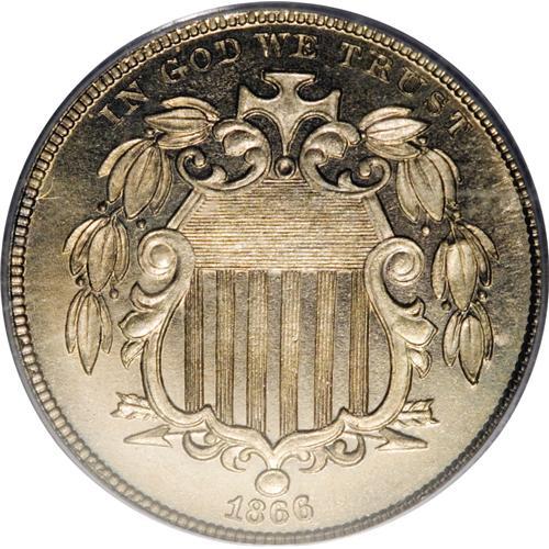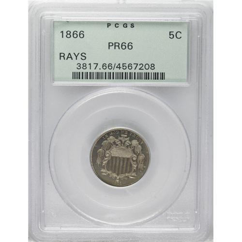 <B>1866 5C Rays Nickel PR66 PCGS.</B></I> The 1866 Rays is important as a proof type coin, since the alternative is the very rare 1867 Rays proof. This attentively struck and undisturbed Premium Gem features lovely honey-gold and ivory-gray toning. Encapsulated in a green label holder.<BR><BR><b>Shipping:</b> Coin/Currency (<a target="_blank" href="http://www.heritageauctions.com/common/shipping.php">view shipping information</a>)