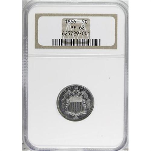 <B>1866 5C Rays PR62 NGC.</B></I> Pastel sky-blue and salmon-pink toning endows this boldly struck specimen. A tiny obverse spot near 3 o'clock is noted, and a subtle granular area is found on the reverse near the stop at 4:30. Only 600+ proofs were struck, and those pieces are under strong demand from proof type set collectors.<BR><BR><b>Shipping:</b> Coins & Currency (<a target="_blank" href="http://www.heritageauctions.com/common/shipping.php">view shipping information</a>)
