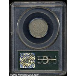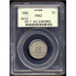 <TABLE cellSpacing=0 cellPadding=0 width="100%" bgColor=#000000 border=0><TBODY><TR><TD width="100%"><TABLE cellSpacing=1 cellPadding=3 width="100%" border=0><TBODY><TR><TD width="100%" bgColor=#79735c><FONT face=arial color=#ffffff size=3><B>Description</B> </FONT></TD></TR><TR><TD width="100%" bgColor=#ffffff><FONT face=arial size=2><B>1866 5C Rays PR62 PCGS.</B></I> Consistent and light chocolate-brown patina endows this nicely struck specimen. The central reverse has a trio of faded abrasions that prevent a finer grade. As the 1867 Rays proofs are extremely rare, proof type set collectors must turn to the 1866 Rays issue. </FONT></TD></TR></TBODY></TABLE></TD></TR></TBODY></TABLE><BR><A name=PricesRealized></A><TABLE cellSpacing=0 cellPadding=0 width="100%" bgColor=#000000 border=0><TBODY><TR><TD width="100%"><TABLE cellSpacing=1 cellPadding=3 width="100%" border=0><TBODY><TR><TD width="100%" bgColor=#79735c><A name=PR><FONT face=arial color=#ffffff size=3><B>Previous Prices from Heritage Auctions</B> </FONT></A></TD></TR><TR><TD bgColor=#f6f6ed><TABLE cellSpacing=0 cellPadding=0 width="100%" border=1><TBODY><TR><TD align=middle width="33%"><B>Date</B></TD><TD align=middle width="33%"><B>Service</B></TD><TD align=middle width="33%"><B>Price</B></TD></TR><TR bgColor=whitesmoke><TD width="33%"><B>05/01/1997</B></TD><TD width="33%">PCGS</TD><TD width="33%">$1,210.00</TD></TR></TBODY></TABLE></TD></TR><TR><TD bgColor=#ffffff><FONT face=arial size=1 ?>PLEASE NOTE: All prices realized reflect the final hammer price PLUS the buyer's premium in auctions that charge a buyer's premium. Each item has a notation at the top of the listing indicating whether that lot included a buyer's premium. Example: A item that sells with a final hammer price of $100 and a 20% buyer's premium will display with a price realized of $120. All information listed is intended to be as accurate as possible, but errors are possible. Please use this guide carefully and inform us of any inaccuracies. </FONT></TD></TR></TBODY></TABLE></TD></TR></TBODY></TABLE><BR><TABLE cellSpacing=0 cellPadding=0 width="100%" bgColor=#000000 border=0><TBODY><TR><TD width="100%"><TABLE cellSpacing=1 cellPadding=3 width="100%" border=0><TBODY><TR><TD width="100%" bgColor=#79735c colSpan=6><FONT face=arial color=#ffffff size=3><B>Price Guide*</B> </FONT></TD></TR><TR bgColor=#f6f6ed><TD align=middle><B>Grade</B> </TD><TD align=middle><B>Coin World<BR>(Trends)</B> </TD><TD align=middle><B>Numismedia<BR>Retail</B> </TD><TD align=middle><B>Numismedia<BR>Wholesale</B> </TD><TD align=middle><B>Coin<BR>Universe</B> </TD><TD align=middle><B>Heritage<BR>Value Index</B> </TD></TR><TR bgColor=#ffffff><TD align=middle>61</TD><TD align=right>---</TD><TD align=right>---</TD><TD align=right>$1,200.00</TD><TD align=right>---</TD><TD align=right>$1,090.83</TD></TR><TR style="FONT-WEIGHT: bold" bgColor=#cccfdd><TD align=middle>62</TD><TD align=right>---</TD><TD align=right>---</TD><TD align=right>$1,325.00</TD><TD align=right>---</TD><TD align=right>$1,224.17</TD></TR><TR bgColor=#ffffff><TD align=middle>63</TD><TD align=right>---</TD><TD align=right>---</TD><TD align=right>$1,590.00</TD><TD align=right>$1,950.00</TD><TD align=right>$1,357.50</TD></TR><TR bgColor=#ffffff><TD colSpan=6><FONT size=1>*All information listed is intended to be as accurate as possible, but errors are possible. No item may be returned or refused based on this information which is provided as a service to our customers. You should contact each pricing source directly to determine the accuracy of this information. </FONT></TD></TR></TBODY></TABLE></TD></TR></TBODY></TABLE><BR><TABLE cellSpacing=0 cellPadding=0 width="100%" bgColor=#000000 border=0><TBODY><TR><TD width="100%"><TABLE cellSpacing=1 cellPadding=3 width="100%" border=0><TBODY><TR><TD width="100%" bgColor=#79735c><FONT face=arial color=#ffffff size=3><B>Population Guide</B> </FONT></TD></TR><TR bgColor=#ffffff><TD align=middle><!-- Begin Output of Population Grid--><TABLE cellSpacing=0 cellPadding=0 width="100%" border=0><TBODY><TR><TD vAlign=center><TABLE cellSpacing=0 width="100%" border=1 cellsadding="3"><TBODY><TR><TD vAlign=center><TABLE cellSpacing=0 cellPadding=3 width="100%" border=1><TBODY><TR><TD vAlign=center align=middle bgColor=#f0f1e8 colSpan=2 <CENTER><FONT face=Arial size=2><B>PCGS Pop </B></FONT><CENTER></CENTER></TD><TD vAlign=center align=middle bgColor=#f0f1e8 colSpan=2><CENTER><FONT face=Arial size=2><B>NGC Pop</B></CENTER></FONT></TD></TR><TR><TD vAlign=center><FONT face=Arial size=2>(62)</FONT> </TD><TD vAlign=center align=right><FONT face=Arial size=2>14</FONT> </TD><TD vAlign=center><FONT face=Arial size=2>(62)</FONT> </TD><TD vAlign=center align=right><FONT face=Arial size=2>4</FONT> </TD></TR><TR><TD vAlign=center><FONT face=Arial size=2>(>62)</FONT> </TD><TD vAlign=center align=right><FONT face=Arial size=2>261</FONT> </TD><TD vAlign=center><FONT face=Arial size=2>(>62)</FONT> </TD><TD vAlign=center align=right><FONT face=Arial size=2>179</FONT> </TD></TR></TBODY></TABLE></TD></TR></TBODY></TABLE></TD></TR></TBODY></TABLE><!-- End Output of Population Grid--> Important notice: Heritage usually auctions material at the rate of 200-250 lots per hour. On some occasions eBay Live bid software or the Internet may not be able to keep up with the pace of the auction. We recommend placing a realistic absentee bid now as insurance to avoid disappointment. Occasionally the auctioneer may eliminate or reject an eBay Live bid, and the auctioneer may also reopen a lot after the close of the eBay live bidding (usually because we missed an audience bid), and may reject your bid even if it shows you as the winning bidder. By bidding via eBay Live, you agree that Heritage may award the lot to another bidder at its sole discretion under the circumstances described above or any other reasonable circumstances. Also please note that all Heritage lots purchased through eBay Live carry a 20% Buyer's Premium. Please 