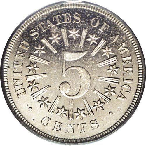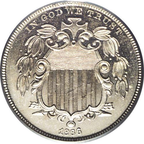 <B>1866<5C> Rays PR64 Cameo PCGS.</B></I> This bright, glassy near-Gem proof exhibits a pleasing cameo effect on each side. The striking details are razor-sharp and worthy of a proof, and only a shallow pinscratch, across the right (facing) side of the vertical shield stripes, and a small contact mark near the reverse border at 4 o'clock, prevent a higher grade designation.