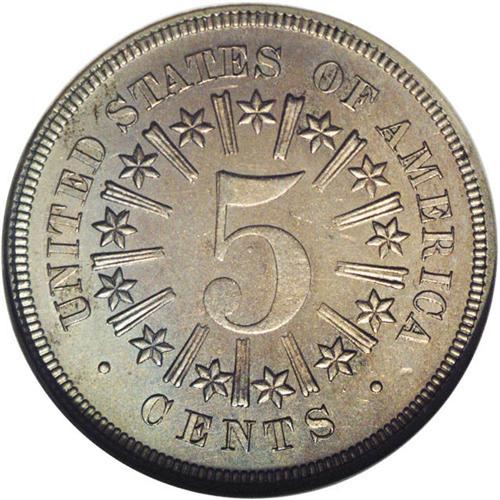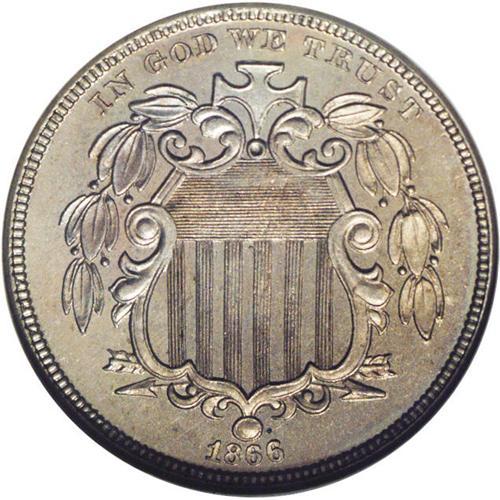 <B>1866<5C> Rays PR64 NGC.</B></I> Blushes of golden and steel-blue patina have a muting effect on the depth of mirrored reflectivity of this challenging first year proof, but the strike is all there and the diagnostic center dots are clearly visible. The actual mintage for the 1866 Rays proof, long reported at just 125 pieces, is more likely in the neighborhood of 300-400 coins.