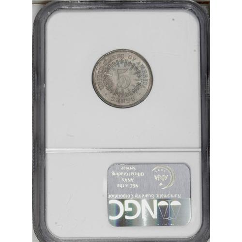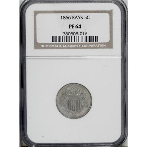 <B>1866<5C> Rays PR64 NGC.</B></I> Iridescent golden-brown and steel-blue colors grace this crisply struck and seemingly conservatively graded specimen. Both sides seem free of hairlines or contact marks. Several of the stars on the reverse are repunched, and the upright of the denominational 5 is recut.