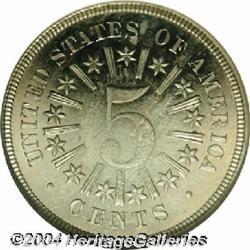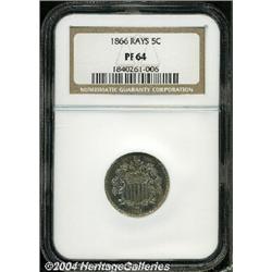 <B>1866<5C> Rays PR64 NGC.</B></I> This boldly struck near-Gem has nicely reflective surfaces and a light overlay of tan patina. Both sides have a center dot, and several of the stars are sharply recut. The upright of the prominent 5 is also recut. The grade is limited by several diagonal planchet striations on the reverse. A low mintage issue, and desirable as a proof Rays type coin. <BR><BR><B>Important notice:</B> Heritage usually auctions material at the rate of 200-250 lots per hour. On some occasions eBay Live bid software or the Internet may not be able to keep up with the pace of the auction. We recommend placing a realistic absentee bid now as insurance to avoid disappointment. Occasionally the auctioneer may eliminate or reject an eBay Live bid, and the auctioneer may also reopen a lot after the close of the eBay live bidding (usually because we missed an audience bid), and may reject your bid even if it shows you as the winning bidder. By bidding via eBay Live, you agree that Heritage may award the lot to another bidder at its sole discretion under the circumstances described above or any other reasonable circumstances. Since eBay bids are not shown to us until we open the lot on the floor, we treat those bids just like floor bids. In most cases the floor responds before the eBay bid is presented to us, due to Internet lag time, so for consistency we have made it a policy that floor bids are always considered first over tie eBay live bids. Also please note that all Heritage lots purchased through eBay Live carry a 20% Buyer's Premium. Please make sure you read the Terms and Conditions before you bid.