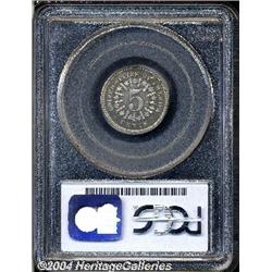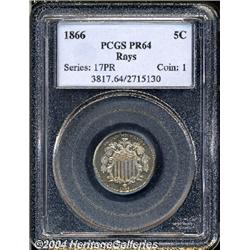 <B>1866<5C> Rays PR64 PCGS.</B></I> The fields are deeply mirrored overall and the coin is lightly toned with attractive golden and blue hues. A small strike through (as made) is seen through OF on the reverse, probably a piece of wire lodged in the die. An impressive proof example of this always popular, initial year of production for nickel Five Cent pieces. <BR><BR><B>Important notice:</B> Heritage usually auctions material at the rate of 200-250 lots per hour. On some occasions eBay Live bid software or the Internet may not be able to keep up with the pace of the auction. We recommend placing a realistic absentee bid now as insurance to avoid disappointment. Occasionally the auctioneer may eliminate or reject an eBay Live bid, and the auctioneer may also reopen a lot after the close of the eBay live bidding (usually because we missed an audience bid), and may reject your bid even if it shows you as the winning bidder. By bidding via eBay Live, you agree that Heritage may award the lot to another bidder at its sole discretion under the circumstances described above or any other reasonable circumstances. Since eBay bids are not shown to us until we open the lot on the floor, we treat those bids just like floor bids. In most cases the floor responds before the eBay bid is presented to us, due to Internet lag time, so for consistency we have made it a policy that floor bids are always considered first over tie eBay live bids. Also please note that all Heritage lots purchased through eBay Live carry a 20% Buyer's Premium. Please make sure you read the Terms and Conditions before you bid.