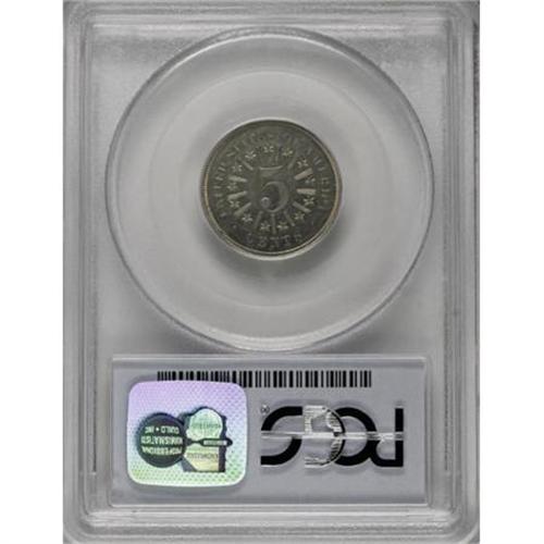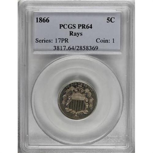 <B>1866 5C Rays PR64 PCGS.</B></I> Unquestionably a proof, as the reverse shows a prominent center dot and recutting along the upper left edge of 5. The obverse also displays a slightly less noticeable center dot. This near-Gem is well struck, with a light coating of greenish-gray toning over both sides, and blemish-free surfaces. As usual for the type, the fields are only mildly reflective. <BR><BR><B>Coin Engraver:</B> James B. Longacre<BR><BR><b>Shipping:</b> Coins & Currency (<a target="_blank" href="http://www.heritageauctions.com/common/shipping.php">view shipping information</a>)