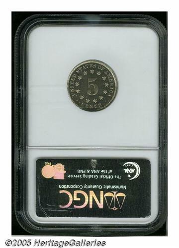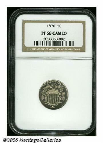 <B>1866<5C> Rays PR65 Cameo PCGS.</B></I> Attractive frost on the devices contrasts favorably with the unmarked mirrored fields. Several of the stars are lightly repunched, as is the upright of the denominational 5. Distributed tiny toning flecks deny technical perfection. Population: 21 in 65 Cameo, 29 finer (6/05).