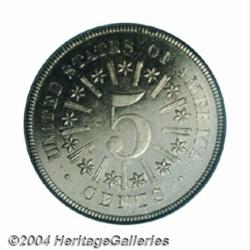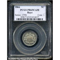 <table><tbody><tr><td><table> <TR><TD width="100%"><TABLE cellSpacing=1 cellPadding=3 width="100%" border=0><TBODY><TR><TD width="100%" bgColor=#79735c><FONT face=arial color=#ffffff size=3><B>Description</B> </FONT></TD></TR><TR><TD width="100%" bgColor=#ffffff><FONT face=arial size=2><B>1866 5C Rays PR65 Cameo PCGS.</B></I> First year of issue, and almost the only year Rays nickels were struck, as the 1867 version is extremely rare. An unknown number of proofs were struck in this year, but it was apparently more than the official mintage of 125 pieces. This is a lightly toned example that shows impressive depth of mirrors in the fields and considerable mint frost on the devices. A few tiny flyspecks of carbon prevent an even higher grade. Population: 19 in 65, 21 finer (10/03). </FONT></TD></TR></TBODY></TABLE></TD></TR></TBODY></TABLE><BR><A name=PricesRealized></A><TABLE cellSpacing=0 cellPadding=0 width="100%" bgColor=#000000 border=0><TBODY><TR><TD width="100%"><TABLE cellSpacing=1 cellPadding=3 width="100%" border=0><TBODY><TR><TD width="100%" bgColor=#79735c><A name=PR><FONT face=arial color=#ffffff size=3><B>Previous Prices from Heritage Auctions</B> </FONT></A></TD></TR><TR><TD bgColor=#f6f6ed><TABLE cellSpacing=0 cellPadding=0 width="100%" border=1><TBODY><TR><TD align=middle width="33%"><B>Date</B></TD><TD align=middle width="33%"><B>Service</B></TD><TD align=middle width="33%"><B>Price</B></TD></TR><TR bgColor=whitesmoke><TD width="33%"><B>07/01/2003</B></TD><TD width="33%">PCGS</TD><TD width="33%">$3,105.00</TD></TR><TR bgColor=whitesmoke><TD width="33%"><B>01/07/2004</B></TD><TD width="33%">PCGS</TD><TD width="33%">$3,795.00</TD></TR><TR bgColor=whitesmoke><TD width="33%"><B>07/29/2003</B></TD><TD width="33%">PCGS</TD><TD width="33%">$4,025.00</TD></TR><TR bgColor=whitesmoke><TD width="33%"><B>02/18/2002</B></TD><TD width="33%">PCGS</TD><TD width="33%">$2,990.00</TD></TR></TBODY></TABLE></TD></TR><TR><TD bgColor=#ffffff><FONT face=arial size=1 ?>PLEASE NOTE: All prices realized reflect the final hammer price PLUS the buyer's premium in auctions that charge a buyer's premium. Each item has a notation at the top of the listing indicating whether that lot included a buyer's premium. Example: A item that sells with a final hammer price of $100 and a 20% buyer's premium will display with a price realized of $120. All information listed is intended to be as accurate as possible, but errors are possible. Please use this guide carefully and inform us of any inaccuracies. </FONT></TD></TR></TBODY></TABLE></TD></TR></TBODY></TABLE><BR><TABLE cellSpacing=0 cellPadding=0 width="100%" bgColor=#000000 border=0><TBODY><TR><TD width="100%"><TABLE cellSpacing=1 cellPadding=3 width="100%" border=0><TBODY><TR><TD width="100%" bgColor=#79735c colSpan=6><FONT face=arial color=#ffffff size=3><B>Price Guide*</B> </FONT></TD></TR><TR bgColor=#f6f6ed><TD align=middle><B>Grade</B> </TD><TD align=middle><B>Coin World<BR>(Trends)</B> </TD><TD align=middle><B>Numismedia<BR>Retail</B> </TD><TD align=middle><B>Numismedia<BR>Wholesale</B> </TD><TD align=middle><B>Coin<BR>Universe</B> </TD><TD align=middle><B>Heritage<BR>Value Index</B> </TD></TR><TR bgColor=#ffffff><TD align=middle>64</TD><TD align=right>---</TD><TD align=right>---</TD><TD align=right>---</TD><TD align=right>---</TD><TD align=right>$2,565.26</TD></TR><TR style="FONT-WEIGHT: bold" bgColor=#cccfdd><TD align=middle>65</TD><TD align=right>---</TD><TD align=right>---</TD><TD align=right>---</TD><TD align=right>$5,500.00</TD><TD align=right>$3,023.33</TD></TR><TR bgColor=#ffffff><TD align=middle>66</TD><TD align=right>---</TD><TD align=right>---</TD><TD align=right>---</TD><TD align=right>$6,250.00</TD><TD align=right>$4,187.50</TD></TR><TR bgColor=#ffffff><TD colSpan=6><FONT size=1>*All information listed is intended to be as accurate as possible, but errors are possible. No item may be returned or refused based on this information which is provided as a service to our customers. You should contact each pricing source directly to determine the accuracy of this information. </FONT></TD></TR></TBODY></TABLE></TD></TR></TBODY></TABLE><BR><TABLE cellSpacing=0 cellPadding=0 width="100%" bgColor=#000000 border=0><TBODY><TR><TD width="100%"><TABLE cellSpacing=1 cellPadding=3 width="100%" border=0><TBODY><TR><TD width="100%" bgColor=#79735c><FONT face=arial color=#ffffff size=3><B>Population Guide</B> </FONT></TD></TR><TR bgColor=#ffffff><TD align=middle><!-- Begin Output of Population Grid--><TABLE cellSpacing=0 cellPadding=0 width="100%" border=0><TBODY><TR><TD vAlign=center><TABLE cellSpacing=0 width="100%" border=1 cellsadding="3"><TBODY><TR><TD vAlign=center><TABLE cellSpacing=0 cellPadding=3 width="100%" border=1><TBODY><TR><TD vAlign=center align=middle bgColor=#f0f1e8 colSpan=2 <CENTER><FONT face=Arial size=2><B>PCGS Pop </B></FONT><CENTER></CENTER></TD><TD vAlign=center align=middle bgColor=#f0f1e8 colSpan=2><CENTER><FONT face=Arial size=2><B>NGC Pop</B></CENTER></FONT></TD></TR><TR><TD vAlign=center><FONT face=Arial size=2>(65)</FONT> </TD><TD vAlign=center align=right><FONT face=Arial size=2>19</FONT> </TD><TD vAlign=center><FONT face=Arial size=2>(65)</FONT> </TD><TD vAlign=center align=right><FONT face=Arial size=2>9</FONT> </TD></TR><TR><TD vAlign=center><FONT face=Arial size=2>(>65)</FONT> </TD><TD vAlign=center align=right><FONT face=Arial size=2>21</FONT> </TD><TD vAlign=center><FONT face=Arial size=2>(>65)</FONT> </TD><TD vAlign=center align=right><FONT face=Arial size=2>18</FONT> </TD></TR></TBODY></TABLE></TD></TR></TBODY></TABLE></TD></TR></TBODY></TABLE><!-- End Output of Population Grid--></TD></TR></TBODY></TABLE></TD></TR></TBODY></TABLE><BR><TABLE cellSpacing=0 cellPadding=0 width="100%" bgColor=#000000 border=0><TBODY><TR> <font color='#000000'><span style='background-color: #FFFFFF'><td bgcolor='#FFFFFE'> Important notice: Heritage usually auctions material at the rate of 200-250 lots per hour. On some occasions eBay Live 