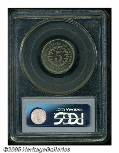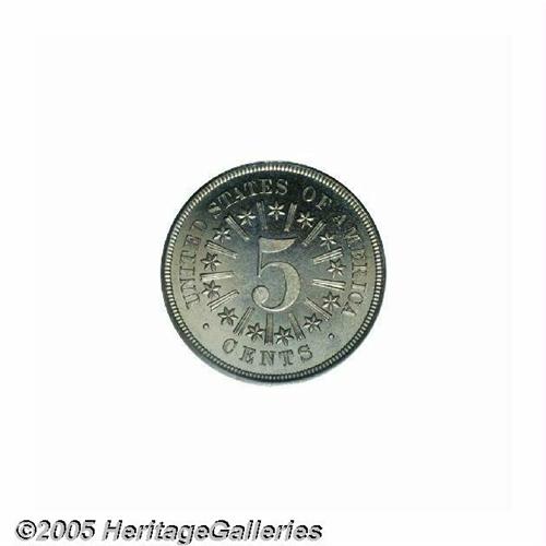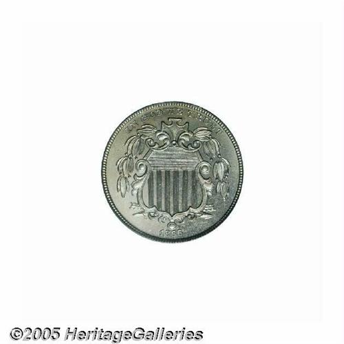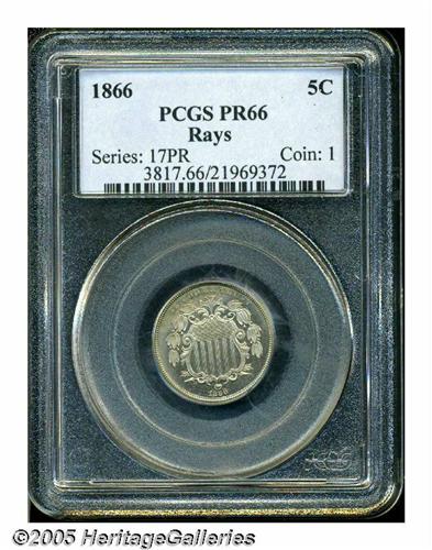 <B>1866<5C> Rays PR66 PCGS.</B></I> A high-contrast example of this popular first year type coin. The diagnostic center dot is plainly visible on the obverse and reverse -- traits found on all genuine proofs of this year. The surfaces show good reflectivity and the coin is mostly brilliant with smoky-golden peripheral color and we can see no obvious out-of-mint problems on either side. Population: 51 in 66, 1 finer (6/05).