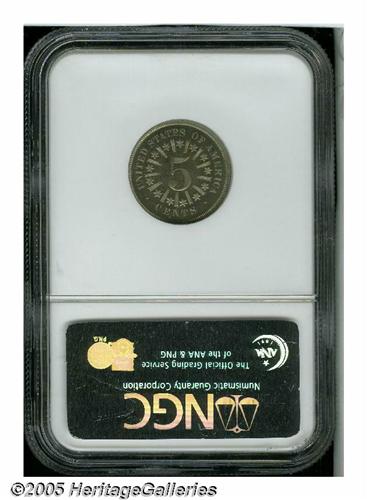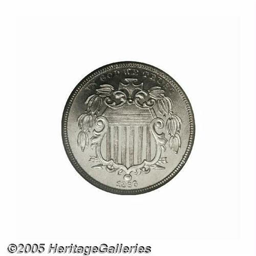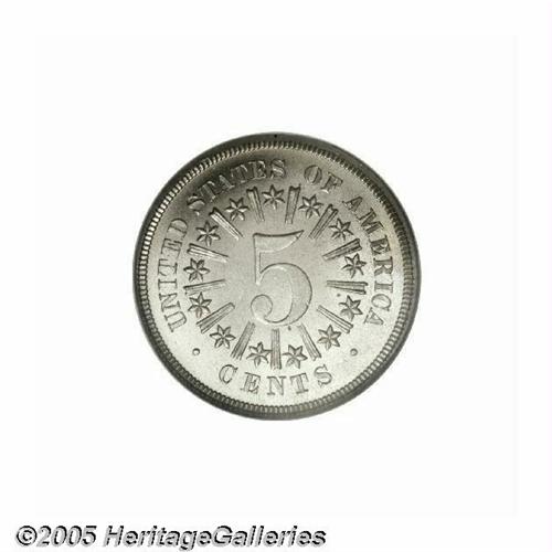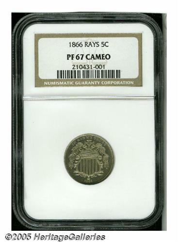 <B>1866<5C> Rays PR67 Cameo NGC.</B></I> Amazingly well preserved with razor sharp definition and solid reflective qualities under an even layer of delicate rose-gray patina. Unlike the vast majority of these early nickel proofs, this Superb specimen boasts an almost perfect planchet and there are only a few scattered flecks of carbon. The proof mintage of this first year Shield Nickel has been underestimated for over a century, the figure often listed of 200+ pieces is more likely double that number. At this outstanding grade level, however, the supply is extremely limited. Population: 8 in 67 Cameo, 0 finer (6/05).