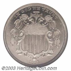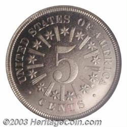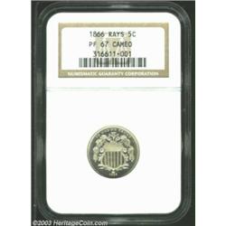 <TABLE cellSpacing=0 cellPadding=0 width="100%" bgColor=#000000 border=0><TBODY><TR><TD width="100%"><TABLE cellSpacing=1 cellPadding=3 width="100%" border=0><TBODY><TR><TD width="100%" bgColor=#79735c><FONT face=arial color=#ffffff size=3><B>Description</B> </FONT></TD></TR><TR><TD width="100%" bgColor=#ffffff><FONT face=arial size=2><B>1866 5C Rays PR67 Cameo NGC.</B></I> While proof 1866 Nickels may not be as scarce as the official mintage suggests, they are definitely a challenge to locate with black and white superb cameo surfaces such as those seen on this coin. Brilliant throughout, the surfaces are exceptionally clean and the contrast is stark between the fields and devices. The two diagnostic die alignment marks are seen at the center of the obverse and reverse. </FONT></TD></TR></TBODY></TABLE></TD></TR></TBODY></TABLE><BR><A name=PricesRealized></A><TABLE cellSpacing=0 cellPadding=0 width="100%" bgColor=#000000 border=0><TBODY><TR><TD width="100%"><TABLE cellSpacing=1 cellPadding=3 width="100%" border=0><TBODY><TR><TD width="100%" bgColor=#79735c><A name=PR><FONT face=arial color=#ffffff size=3><B>Previous Prices from Heritage Auctions</B> </FONT></A></TD></TR><TR><TD bgColor=#f6f6ed><TABLE cellSpacing=0 cellPadding=0 width="100%" border=1><TBODY><TR><TD align=middle width="33%"><B>Date</B></TD><TD align=middle width="33%"><B>Service</B></TD><TD align=middle width="33%"><B>Price</B></TD></TR><TR bgColor=whitesmoke><TD width="33%"><B>03/23/2003</B></TD><TD width="33%">NGC</TD><TD width="33%">$17,825.00</TD></TR></TBODY></TABLE></TD></TR><TR><TD bgColor=#ffffff><FONT face=arial size=1 ?>PLEASE NOTE: All prices realized reflect the final hammer price PLUS the buyer's premium in auctions that charge a buyer's premium. Each item has a notation at the top of the listing indicating whether that lot included a buyer's premium. Example: A item that sells with a final hammer price of $100 and a 20% buyer's premium will display with a price realized of $120. All information listed is intended to be as accurate as possible, but errors are possible. Please use this guide carefully and inform us of any inaccuracies. </FONT></TD></TR></TBODY></TABLE></TD></TR></TBODY></TABLE><BR><TABLE cellSpacing=0 cellPadding=0 width="100%" bgColor=#000000 border=0><TBODY><TR><TD width="100%"><TABLE cellSpacing=1 cellPadding=3 width="100%" border=0><TBODY><TR><TD width="100%" bgColor=#79735c colSpan=6><FONT face=arial color=#ffffff size=3><B>Price Guide*</B> </FONT></TD></TR><TR bgColor=#f6f6ed><TD align=middle><B>Grade</B> </TD><TD align=middle><B>Coin World<BR>(Trends)</B> </TD><TD align=middle><B>Numismedia<BR>Retail</B> </TD><TD align=middle><B>Numismedia<BR>Wholesale</B> </TD><TD align=middle><B>Coin<BR>Universe</B> </TD><TD align=middle><B>Heritage<BR>Value Index</B> </TD></TR><TR bgColor=#ffffff><TD align=middle>66</TD><TD align=right>---</TD><TD align=right>---</TD><TD align=right>---</TD><TD align=right>---</TD><TD align=right>---</TD></TR><TR style="FONT-WEIGHT: bold" bgColor=#cccfdd><TD align=middle>67</TD><TD align=right>---</TD><TD align=right>---</TD><TD align=right>---</TD><TD align=right>---</TD><TD align=right>---</TD></TR><TR bgColor=#ffffff><TD align=middle>68</TD><TD align=right>---</TD><TD align=right>---</TD><TD align=right>---</TD><TD align=right>---</TD><TD align=right>---</TD></TR><TR bgColor=#ffffff><TD colSpan=6><FONT size=1>*All information listed is intended to be as accurate as possible, but errors are possible. No item may be returned or refused based on this information which is provided as a service to our customers. You should contact each pricing source directly to determine the accuracy of this information. </FONT></TD></TR></TBODY></TABLE></TD></TR></TBODY></TABLE><BR><TABLE cellSpacing=0 cellPadding=0 width="100%" bgColor=#000000 border=0><TBODY><TR><TD width="100%"><TABLE cellSpacing=1 cellPadding=3 width="100%" border=0><TBODY><TR><TD width="100%" bgColor=#79735c><FONT face=arial color=#ffffff size=3><B>Population Guide</B> </FONT></TD></TR><TR bgColor=#ffffff><TD align=middle><!-- Begin Output of Population Grid--><TABLE cellSpacing=0 cellPadding=0 width="100%" border=0><TBODY><TR><TD vAlign=center><TABLE cellSpacing=0 width="100%" border=1 cellsadding="3"><TBODY><TR><TD vAlign=center><TABLE cellSpacing=0 cellPadding=3 width="100%" border=1><TBODY><TR><TD vAlign=center align=middle bgColor=#f0f1e8 colSpan=2 <CENTER><FONT face=Arial size=2><B>PCGS Pop </B></FONT><CENTER></CENTER></TD><TD vAlign=center align=middle bgColor=#f0f1e8 colSpan=2><CENTER><FONT face=Arial size=2><B>NGC Pop</B></CENTER></FONT></TD></TR><TR><TD vAlign=center><FONT face=Arial size=2>(67)</FONT> </TD><TD vAlign=center align=right><FONT face=Arial size=2>2</FONT> </TD><TD vAlign=center><FONT face=Arial size=2>(67)</FONT> </TD><TD vAlign=center align=right><FONT face=Arial size=2>5</FONT> </TD></TR><TR><TD vAlign=center><FONT face=Arial size=2>(>67)</FONT> </TD><TD vAlign=center align=right><FONT face=Arial size=2>0</FONT> </TD><TD vAlign=center><FONT face=Arial size=2>(>67)</FONT> </TD><TD vAlign=center align=right><FONT face=Arial size=2>0</FONT> </TD></TR></TBODY></TABLE></TD></TR></TBODY></TABLE></TD></TR></TBODY></TABLE><!-- End Output of Population Grid--> Important notice: Heritage usually auctions material at the rate of 200-250 lots per hour. On some occasions eBay Live bid software or the Internet may not be able to keep up with the pace of the auction. We recommend placing a realistic absentee bid now as insurance to avoid disappointment. Occasionally the auctioneer may eliminate or reject an eBay Live bid, and the auctioneer may also reopen a lot after the close of the eBay live bidding (usually because we missed an audience bid), and may reject your bid even if it shows you as the winning bidder. By bidding via eBay Live, you agree that Heritage may award the lot to another bidder at its sole discretion under the circumstances described above or any other reasonable circumstances. Als