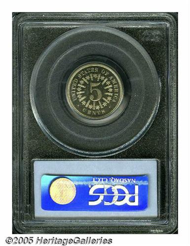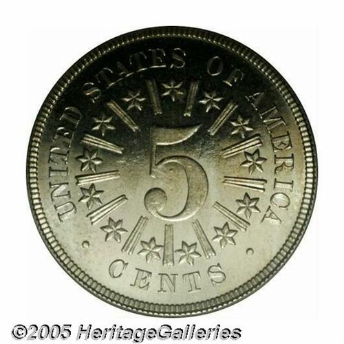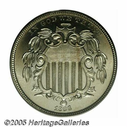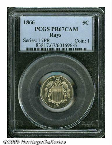 <B>1866<5C> Rays PR67 Cameo PCGS.</B></I> This is an absolutely breathtaking type coin. The surfaces are essentially perfect, as one can infer from the very high grade given this piece. The fields are also predictably deeply reflective with intense mint frost over the devices. Presenting as untoned close examination reveals a hint of pale pastel-golden color, particularly on the reverse. Perfect for the collector of high grade type or a date collector who must have only the best. Population: 3 in 67 Cameo, none finer at either service (5/05).<BR><I>From The Western Hills Collection.</B></I>