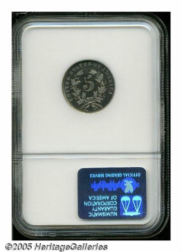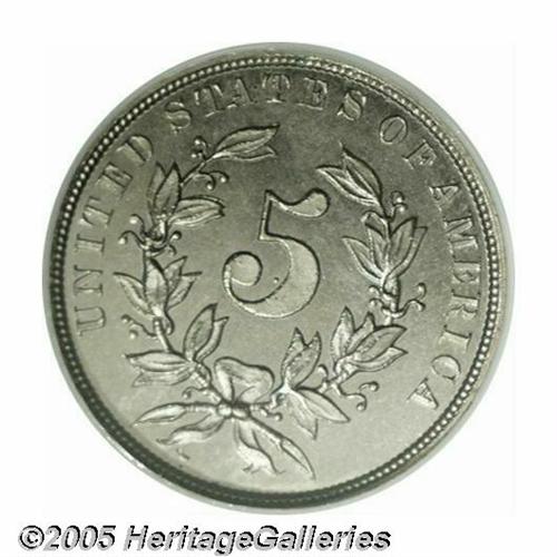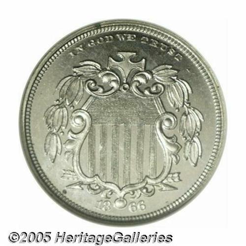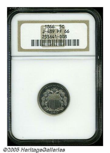 <B>1866<5C> Shield Five Cents, Judd-489, Pollock-577, Low R.6, PR66 NGC.</B></I> The obverse has a shield design similar to that adopted for the regular issue Shield nickel, except that the motto IN GOD WE TRUST is expressed in smaller letters and the date is divided by the ball at the base of the shield. On the reverse, a fancy numeral 5 is surrounded by a laurel wreath, with the legend UNITED STATES OF AMERICA around the rim. Struck in nickel with a plain edge. Offered here is a well mirrored Premium Gem with a coating of light gray patina over both sides.<BR><I>From The Western Hills Collection.</B></I>