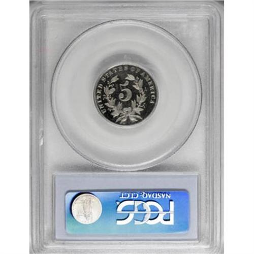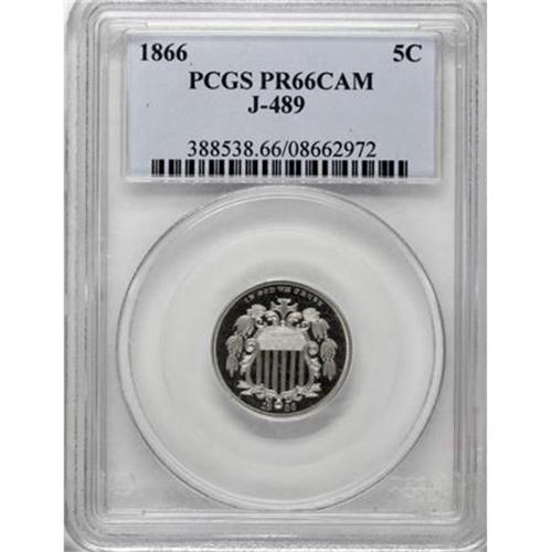 <B>1866 5C Shield Five Cents, Judd-489, Pollock-577, Low R.6, PR66 Cameo PCGS.</B></I> The obverse has a shield design similar to that adopted for the regular issue Shield nickel, except that the motto IN GOD WE TRUST is expressed in smaller letters and the date is divided by the ball at the base of the shield. On the reverse, the "Dutch" 5 is surrounded by a laurel wreath, with the legend UNITED STATES OF AMERICA around the rim. Struck in nickel with a plain edge. These patterns show an interesting die punching error with the second T in TRUST far to the right of the final position. Brilliant throughout, the fields are deeply reflective and the devices display a significant overlay of mint frost which gives the coin its cameo effect.<BR><BR><b>Shipping:</b> Coins & Currency (<a target="_blank" href="http://www.heritageauctions.com/common/shipping.php">view shipping information</a>)