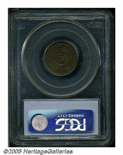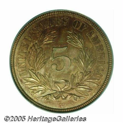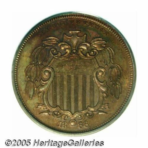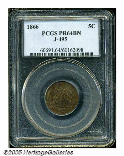 <B>1866<5C> Shield Five Cents, Judd-495, Pollock-582, High R.7, PR64 Brown PCGS.</B></I> A Shield design on the obverse is quite similar to the regularly issued design, although the shield is lower in the field, with the ball at the bottom dividing the date. At the top of the obverse, IN GOD WE TRUST is in very small letters. The reverse has a short 5 inside a wreath consisting of two laurel branches tied at the bottom by a ribbon with bow. Outside the wreath, the statutory legend begins at 8 o'clock and ends at 4 o'clock. Struck in copper with a plain edge. This is a lovely near-Gem with moderately mirrored fields and a deep golden-brown color overall.<BR><I>From The Western Hills Collection.</B></I>