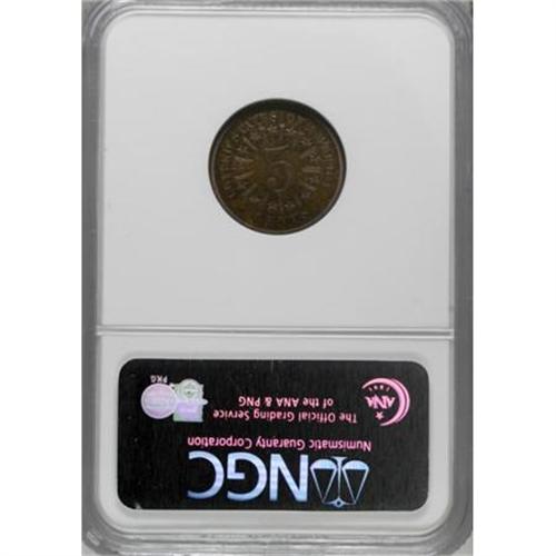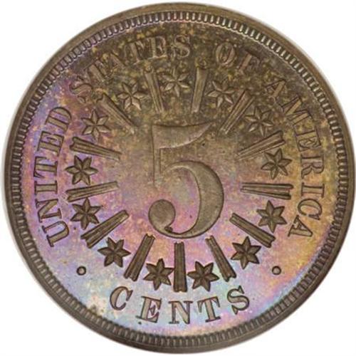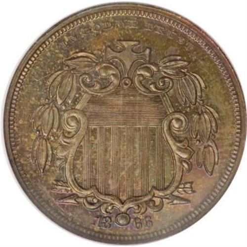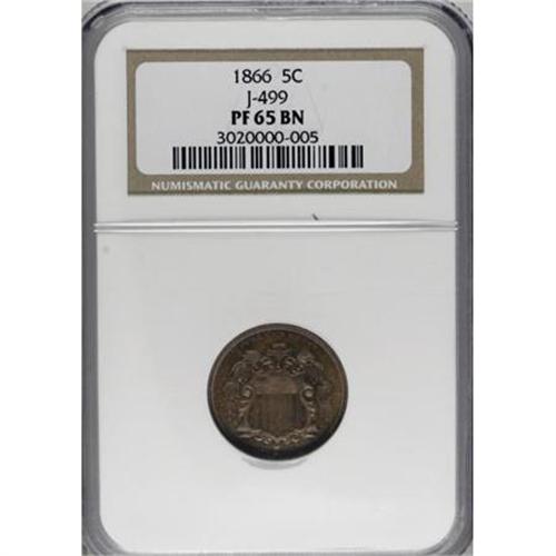 <B>1866 5C Shield Five Cents, Judd-499, Pollock-584, High R.7, PR65 Brown NGC.</B></I> Shield nickel pattern with the motto in small letters in the field above the cross of Calatrava, the date is also separated by the ball at the bottom. The reverse shows the regular stars and rays design. Struck in copper or bronze with a plain edge. Fewer than a dozen examples are believed known of this pattern in copper/bronze. The fields are bright and reflective which gives the rich, multicolored toning enhanced eye appeal. This rare pattern also displays the tentative punching of the final T in TRUST far to the right of its final position with the second leaf on the right pointing to the remnant of the letter.<BR><BR><b>Shipping:</b> Coins & Currency (<a target="_blank" href="http://www.heritageauctions.com/common/shipping.php">view shipping information</a>)