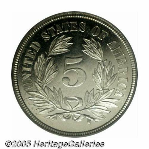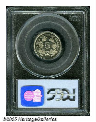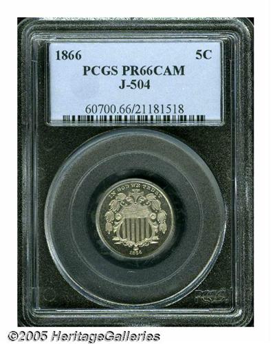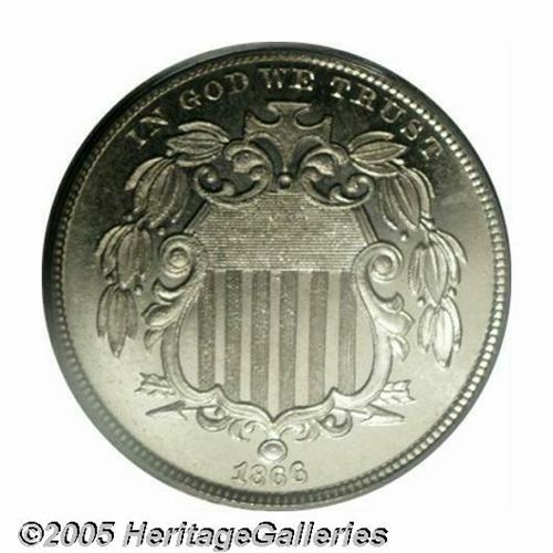 <B>1866<5C> Shield Five Cents, Judd-504, Pollock-589, Low R.7, PR66 Cameo PCGS.</B></I> Regular dies obverse, paired with a reverse that features a squatty numeral 5 within a wreath rather than stars as on the adopted issue. Struck in nickel with a plain edge. This high grade specimen is mostly brilliant and displays a curious bit of die rust on the left portion of the shield.<BR><I>From The Western Hills Collection.</B></I>