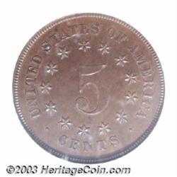 <table><tr><td><TABLE cellSpacing=0 cellPadding=0 width="100%" bgColor=#000000 border=0><TBODY> <TR><TD width="100%"><TABLE cellSpacing=1 cellPadding=3 width="100%" border=0><TBODY><TR><TD width="100%" bgColor=#79735c><FONT face=arial color=#ffffff size=3><B>Description</B> </FONT></TD></TR><TR><TD width="100%" bgColor=#ffffff><FONT face=arial size=2><B>1866 5C Shield Five Cents, Judd-508, Pollock-592, R.6, PR66 Brown NGC.</B></I> Struck from a regular obverse die 1866 Shield Nickel, while the reverse prototypes the No Rays design that was produced for circulation the following year. Struck in copper with a plain edge. The ball of the prominent 5 is die doubled. The deep chocolate-brown patina is consistent and attractive, and the preservation is seemingly unimprovable. The present Gem is the single finest certified by either major service. Neither PCGS nor NGC has certified a Red example of Judd-508. </FONT></TD></TR></TBODY></TABLE></TD></TR></TBODY></TABLE><BR><A name=PricesRealized></A><TABLE cellSpacing=0 cellPadding=0 width="100%" bgColor=#000000 border=0><TBODY><TR><TD width="100%"><TABLE cellSpacing=1 cellPadding=3 width="100%" border=0><TBODY><TR><TD width="100%" bgColor=#79735c><A name=PR><FONT face=arial color=#ffffff size=3><B>Previous Prices from Heritage Auctions</B> </FONT></A></TD></TR><TR><TD bgColor=#f6f6ed>No Prior Data Recorded </TD></TR><TR><TD bgColor=#ffffff><FONT face=arial size=1 ?>PLEASE NOTE: All prices realized reflect the final hammer price PLUS the buyer's premium in auctions that charge a buyer's premium. Each item has a notation at the top of the listing indicating whether that lot included a buyer's premium. Example: A item that sells with a final hammer price of $100 and a 20% buyer's premium will display with a price realized of $120. All information listed is intended to be as accurate as possible, but errors are possible. Please use this guide carefully and inform us of any inaccuracies. </FONT></TD></TR></TBODY></TABLE></TD></TR></TBODY></TABLE><BR><TABLE cellSpacing=0 cellPadding=0 width="100%" bgColor=#000000 border=0><TBODY><TR><TD width="100%"><TABLE cellSpacing=1 cellPadding=3 width="100%" border=0><TBODY><TR><TD width="100%" bgColor=#79735c colSpan=6><FONT face=arial color=#ffffff size=3><B>Price Guide*</B> </FONT></TD></TR><TR bgColor=#f6f6ed><TD align=middle><B>Grade</B> </TD><TD align=middle><B>Coin World<BR>(Trends)</B> </TD><TD align=middle><B>Numismedia<BR>Retail</B> </TD><TD align=middle><B>Numismedia<BR>Wholesale</B> </TD><TD align=middle><B>Coin<BR>Universe</B> </TD><TD align=middle><B>Heritage<BR>Value Index</B> </TD></TR><TR bgColor=#ffffff><TD align=middle>65</TD><TD align=right>---</TD><TD align=right>---</TD><TD align=right>---</TD><TD align=right>---</TD><TD align=right>---</TD></TR><TR style="FONT-WEIGHT: bold" bgColor=#cccfdd><TD align=middle>66</TD><TD align=right>---</TD><TD align=right>---</TD><TD align=right>---</TD><TD align=right>---</TD><TD align=right>---</TD></TR><TR bgColor=#ffffff><TD align=middle>67</TD><TD align=right>---</TD><TD align=right>---</TD><TD align=right>---</TD><TD align=right>---</TD><TD align=right>---</TD></TR><TR bgColor=#ffffff><TD colSpan=6><FONT size=1>*All information listed is intended to be as accurate as possible, but errors are possible. No item may be returned or refused based on this information which is provided as a service to our customers. You should contact each pricing source directly to determine the accuracy of this information. </FONT></TD></TR></TBODY></TABLE></TD></TR></TBODY></TABLE><BR><TABLE cellSpacing=0 cellPadding=0 width="100%" bgColor=#000000 border=0><TBODY><TR><TD width="100%"><TABLE cellSpacing=1 cellPadding=3 width="100%" border=0><TBODY><TR><TD width="100%" bgColor=#79735c><FONT face=arial color=#ffffff size=3><B>Population Guide</B> </FONT></TD></TR><TR bgColor=#ffffff><TD align=middle></TD></TR></TBODY></TABLE></TD></TR></TBODY></TABLE><BR><TABLE cellSpacing=0 cellPadding=0 width="100%" bgColor=#000000 border=0><TBODY><TR> Important notice: Heritage usually auctions material at the rate of 200-250 lots per hour. On some occasions eBay Live bid software or the Internet may not be able to keep up with the pace of the auction. We recommend placing a realistic absentee bid now as insurance to avoid disappointment. Occasionally the auctioneer may eliminate or reject an eBay Live bid, and the auctioneer may also reopen a lot after the close of the eBay live bidding (usually because we missed an audience bid), and may reject your bid even if it shows you as the winning bidder. By bidding via eBay Live, you agree that Heritage may award the lot to another bidder at its sole discretion under the circumstances described above or any other reasonable circumstances. Also please note that all Heritage lots purchased through eBay Live carry a 20% Buyer's Premium. Please make sure you read the Terms and Conditions before you bid.</TD></TR></TBODY></TABLE></TD></TR></TBODY></TABLE>