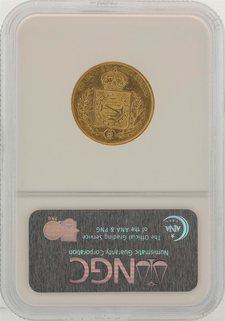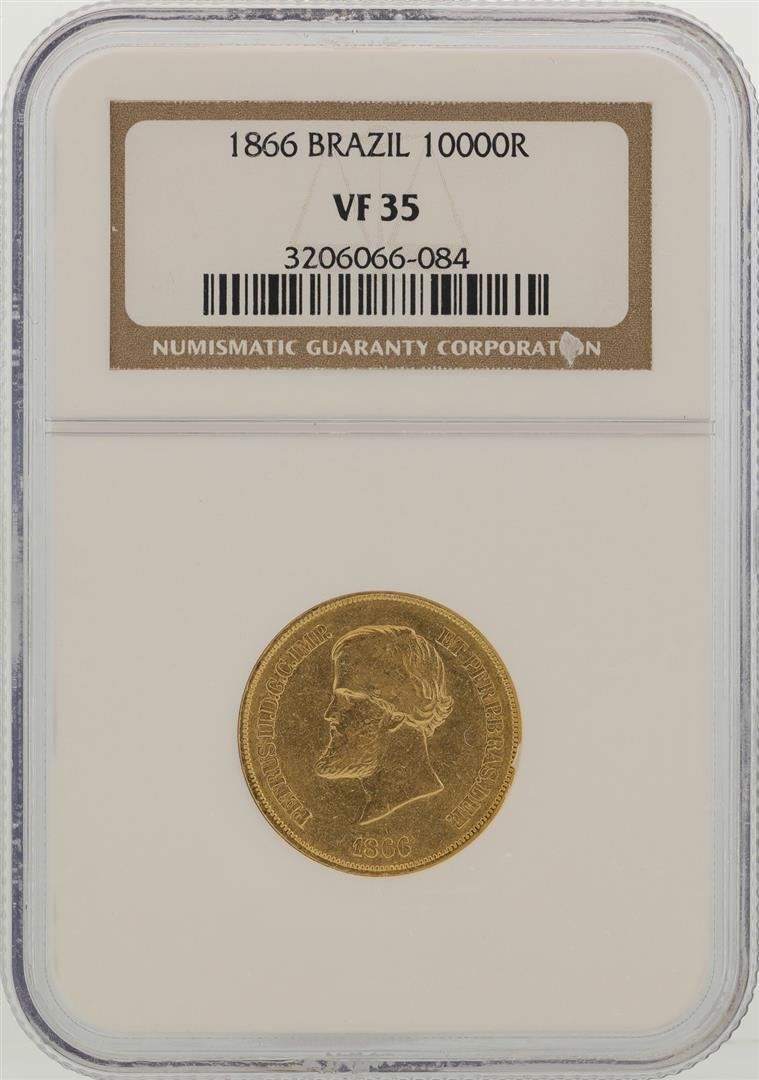 One 1866 Brazil 10000 Reis Gold Coin NGC VF35. NGC Certified.