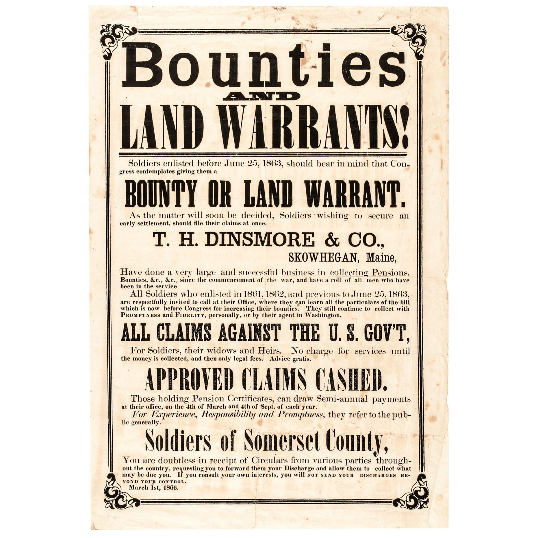 March 1, 1866-Dated Civil War Era, Broadside: “BOUNTIES AND LAND WARRANTS!” Skowhegan, Maine, Very Fine.