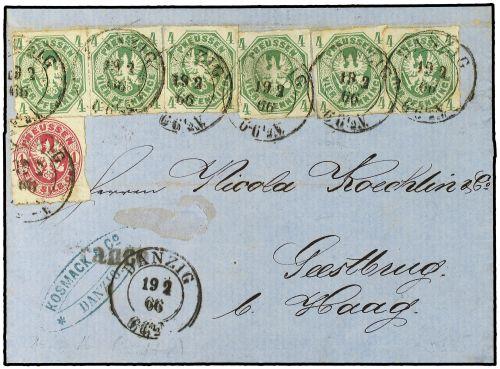 1866 Cover from Danzig to The Hague, Netherlands franked by unusual usage of 1861-65 6x4 pf. green and single 1 sgr. rose all tied by Danzig (Feb 19) cds´s. Straight line ´Rijswijk´ on reverse. Sl. horizontal filing crease but a scarce and colourful usage. Scott 15,17.