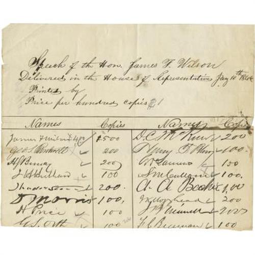 <B>1866 Document With the Congressmen Signatures.</B></I> One page, 8” x 6.5”. A ledger-style document dated January 10, 1866 signed by several members of the United States House of Representatives. The most recognizable name on the list is that of Thaddeus Stevens but the signature appears to be not in his own hand. With the usual fold creases, some small chips at the edges, toned from age, else very good. <I>Ex. Henry E. Luhrs Collection.</B></I> <BR><BR><b>Shipping:</b> Flat Material, Small (<a target="_blank" href="http://www.heritageauctions.com/common/shipping.php">view shipping information</a>)