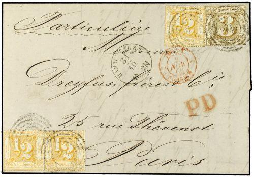 1866 Envelope to FRANCE bearing 1/2 sgr yellow (3) (SG 41) and 3 sgr brown (SG 44) tied by concentric ring cancel with adjacent HAMBURG TH & T datestamp, handstruck PD and French entry cachet with PARIS arrival. Superb cover.