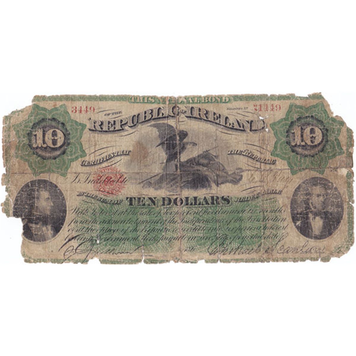 These bonds were issued in America to fund the Fenian Rising of 1867 and were "redeemable six months after the acknowledgement of the Independence of the Irish Nation". They were intended to raise funds and finance attacks against British interests worldwide. A scarcer denomination, signed by JJ Sullivan and Michael Scanlon, in poor condition. These bonds were issued in America to fund the Fenian Rising of 1867 and were "redeemable six months after the acknowledgement of the Independence of the Irish Nation".