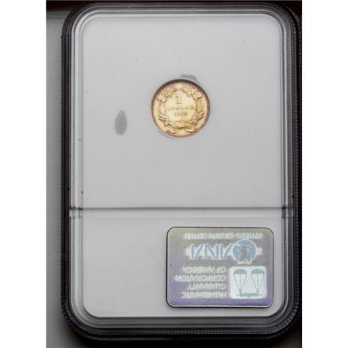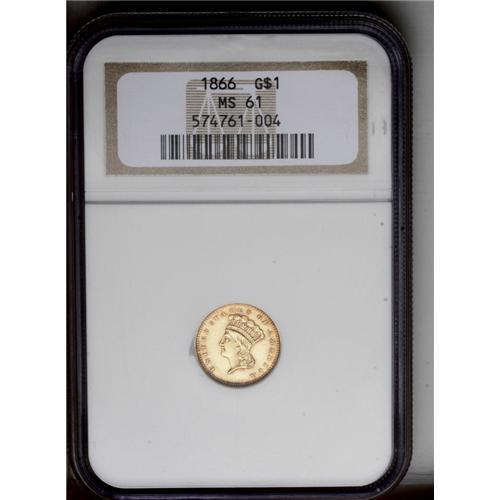 <B>1866 G$1 MS61 NGC.</B></I> Good portions of mint luster are still seen around the devices, and a number of hairlines in the fields are the most mentionable surface flaws. Deep reddish color is seen overall. Only 7,100 business strikes were produced of this issue.