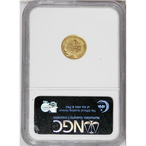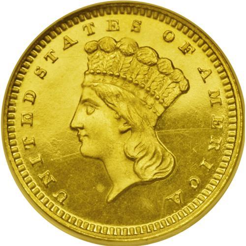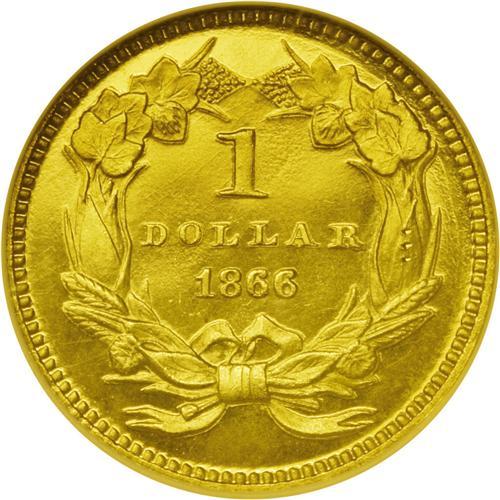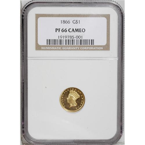 <B>1866<G$1> PR66 Cameo NGC.</B></I> This issue is extremely scarce, given the original proof mintage of only 30 coins, supplemented by 7,130 business strikes. The Breen proof <I>Encyclopedia</B></I> says of this issue, "Date from the half dime logotype, heavy, nearer to ribbon bows than to DOLLAR, and level. ... Heavy low date, wreath tops joined. Almost R-7." As Breen was using the Sheldon scale, that meant a surviving population of not much more than 4 to 12 examples. In fact, the NGC <I>Census Report</B></I> lists 12 proof examples, all but one of them designated Cameo, while the PCGS data list 20 examples. This coin--which in any case is <I>among the highest graded examples at either service</B></I>--does show a heavy date and joined wreath tips. The interiors of the O and A in DOLLAR are still frosty. The frosted devices contrast well with the deeply mirrored fields. A lintmark is noted in the left obverse field. Census: 3 in 66 Cameo, 0 finer (7/06).