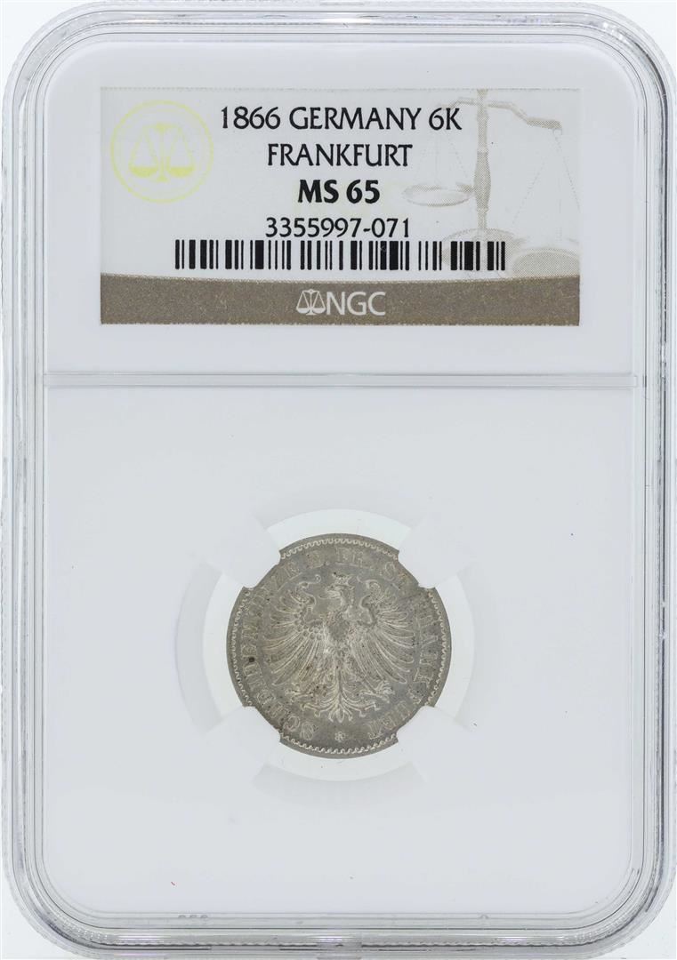 One 1866 Germany Frankfurt 6 Kreuzer Coin NGC MS65. NGC Certified.