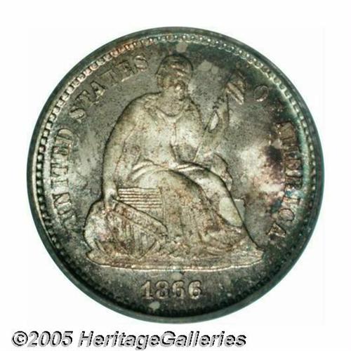 <B>1866<H10C> MS67 PCGS.</B></I> A pristine, heavily frosted example overlaid in fine speckles of golden and turquoise toning that yields to a window of brilliance at the center of the reverse. Just 10,000 business strikes were produced and, of perhaps 100 Mint State survivors, only a handful could possibly match the quality of this Superb representative. Population: 3 in 67, 0 finer (4/05).