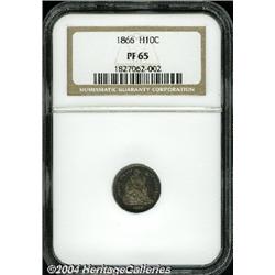 <B>1866<H10C> PR65 NGC.</B></I> A richly toned proof half dime, outlined in bluish-green hues and with steel-gray and violet shades in the centers. Like the 1865, this date sells for a premium due to the scarcity of business strikes. Population: 17 in 65, 11 finer (9/04). <BR><BR><B>Important notice:</B> Heritage usually auctions material at the rate of 200-250 lots per hour. On some occasions eBay Live bid software or the Internet may not be able to keep up with the pace of the auction. We recommend placing a realistic absentee bid now as insurance to avoid disappointment. Occasionally the auctioneer may eliminate or reject an eBay Live bid, and the auctioneer may also reopen a lot after the close of the eBay live bidding (usually because we missed an audience bid), and may reject your bid even if it shows you as the winning bidder. By bidding via eBay Live, you agree that Heritage may award the lot to another bidder at its sole discretion under the circumstances described above or any other reasonable circumstances. Since eBay bids are not shown to us until we open the lot on the floor, we treat those bids just like floor bids. In most cases the floor responds before the eBay bid is presented to us, due to Internet lag time, so for consistency we have made it a policy that floor bids are always considered first over tie eBay live bids. Also please note that all Heritage lots purchased through eBay Live carry a 20% Buyer's Premium. Please make sure you read the Terms and Conditions before you bid.