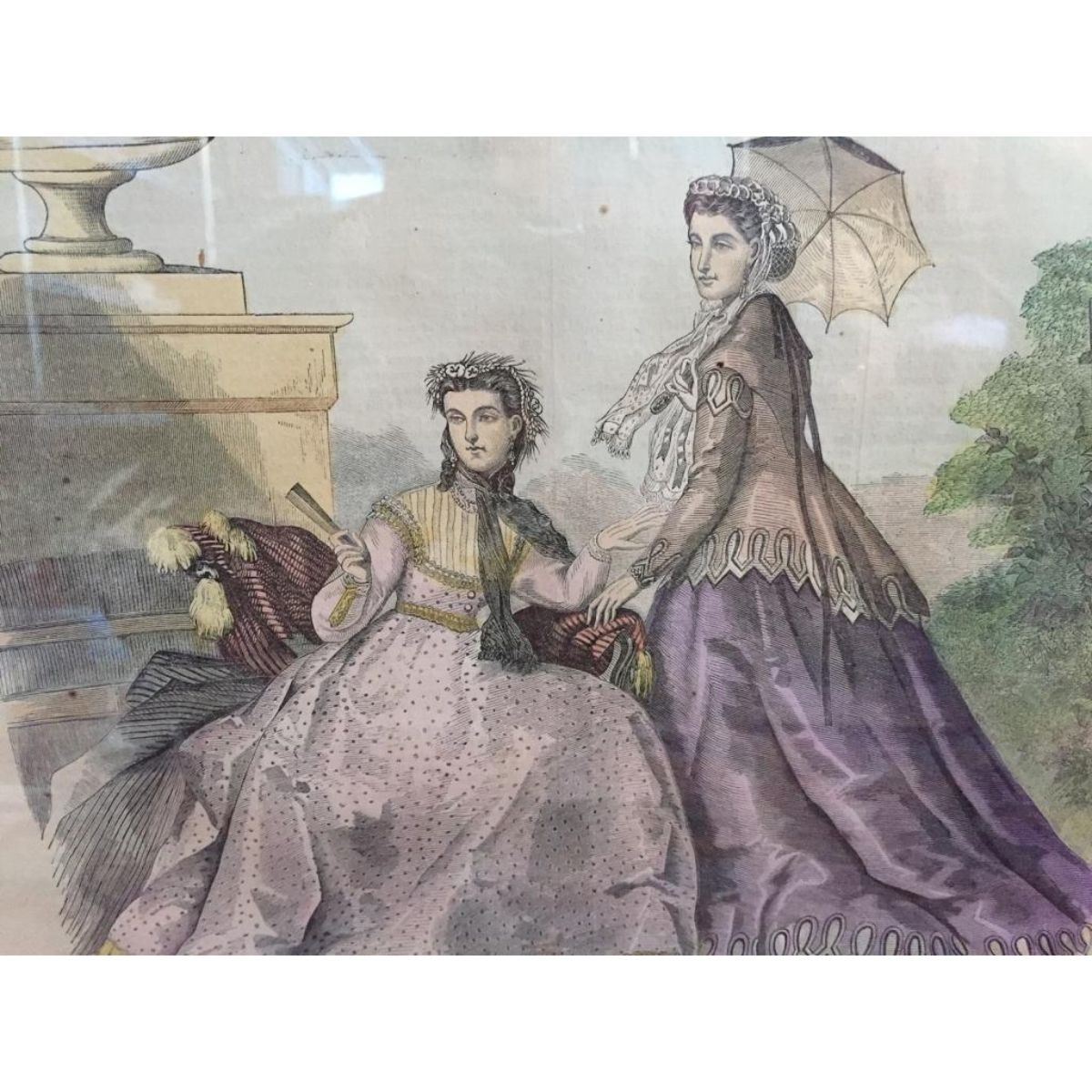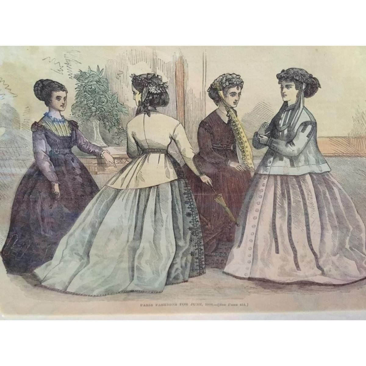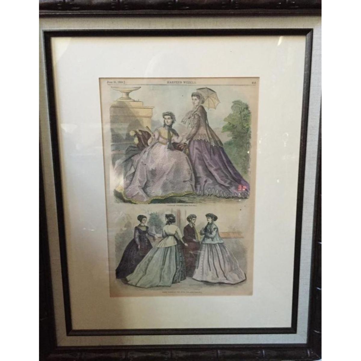 1866 Harper's Weekly Illustrated Newspaper wood engraving, dated June 30, 1866. Two engravings top & bottom showing ladies fashion/ dresses of the day in Paris. Matted under glass in a 20" X 24" Bronze gilt wood