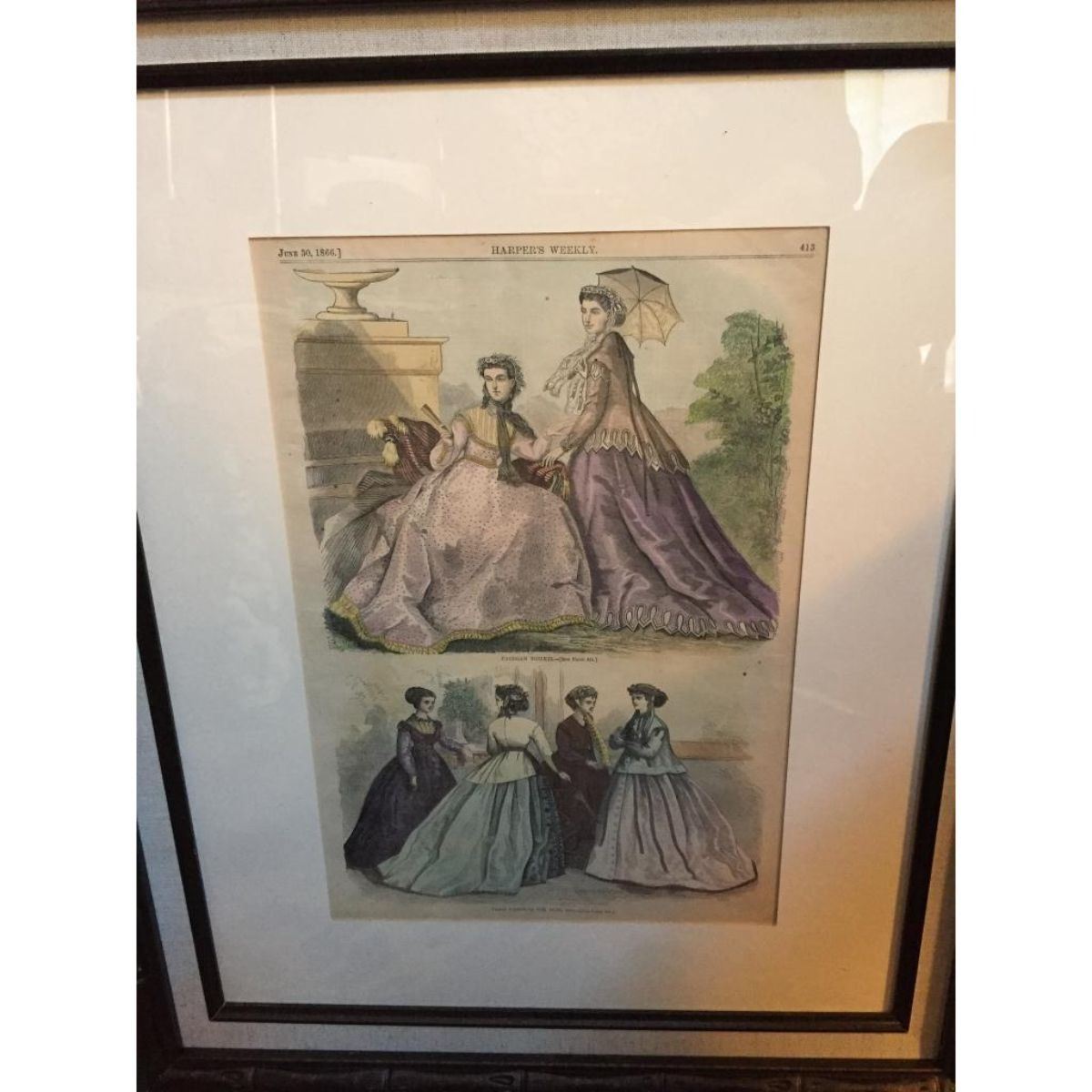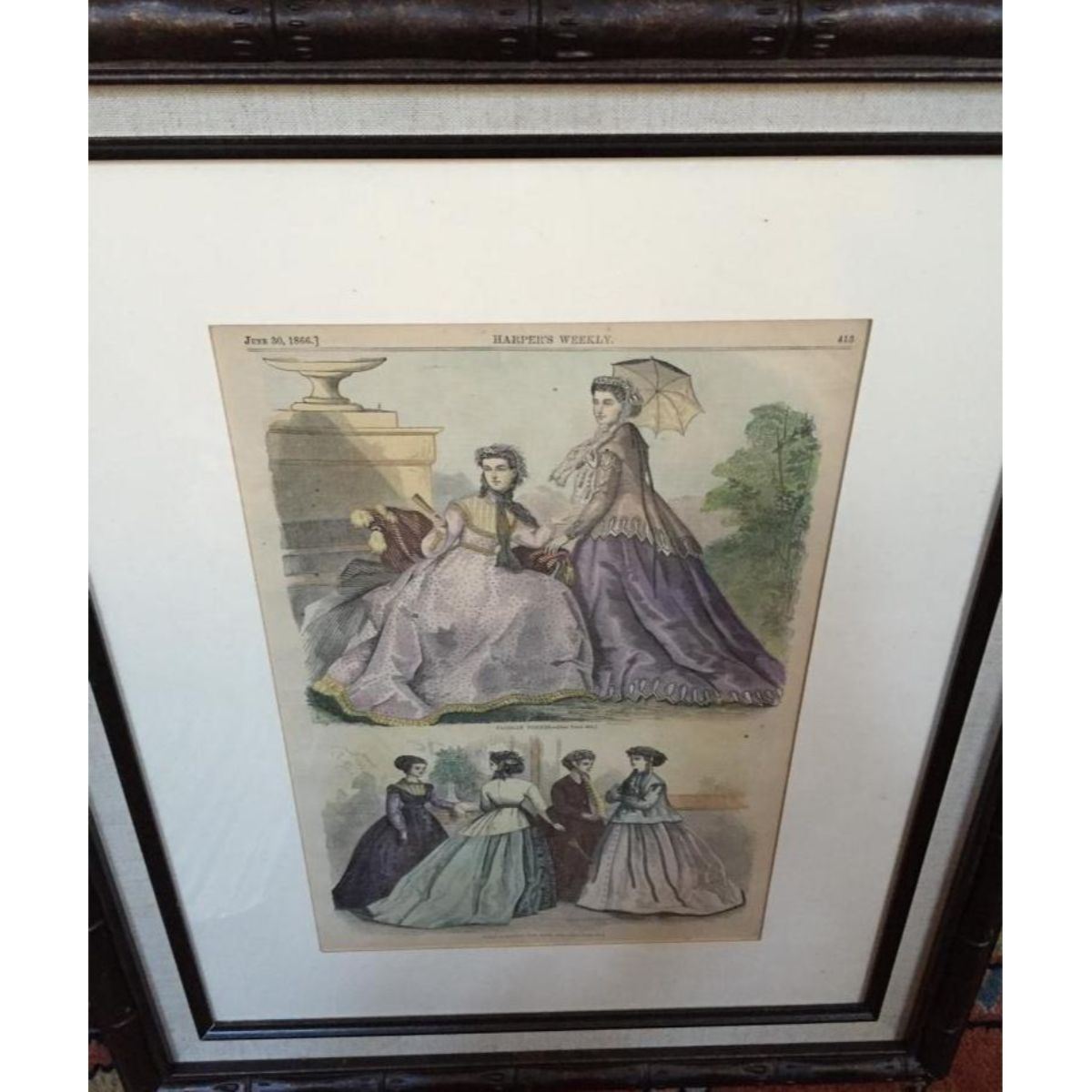 1866 Harper's Weekly Illustrated Newspaper wood engraving, dated June 30, 1866. Two engravings top & bottom showing ladies fashion/ dresses of the day in Paris. Matted under glass in a 20" X 24" Bronze gilt wood