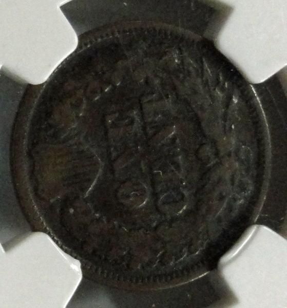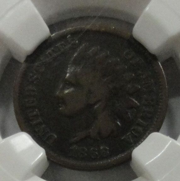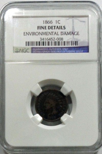 1866 INDIAN ONE CENT NGC, FINE, SAYS DAMAGE, IT'S ONLY A LITTLE DARK