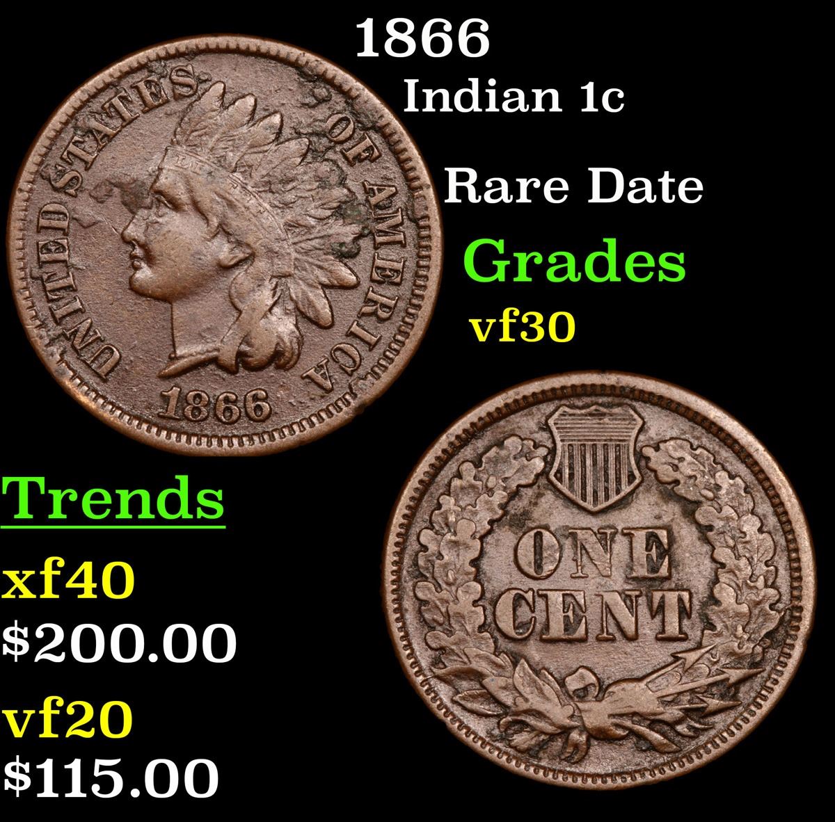1866 Rare Date . Indian Cent 1c Grades vf++. According to David Hall from PCGS, 'The 1866, 1867, and 1868 Indian cents are of approximate equal rarity. All three are definitely rarer than the 1864 and 1865.
