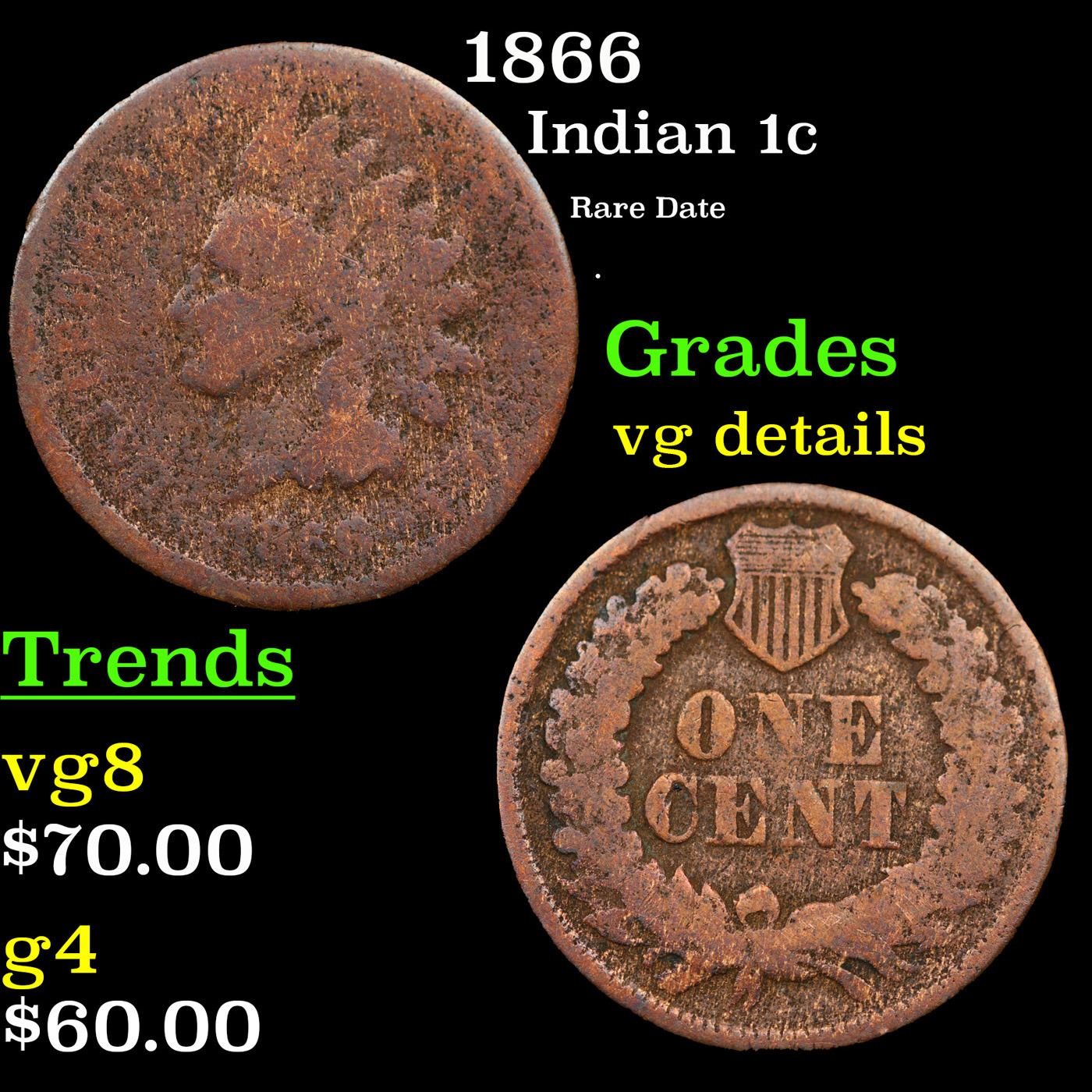 1866 Indian Cent 1c Grades vg details. According to David Hall from PCGS, 'The 1866, 1867, and 1868 Indian cents are of approximate equal rarity. All three are definitely rarer than the 1864 and 1865.
