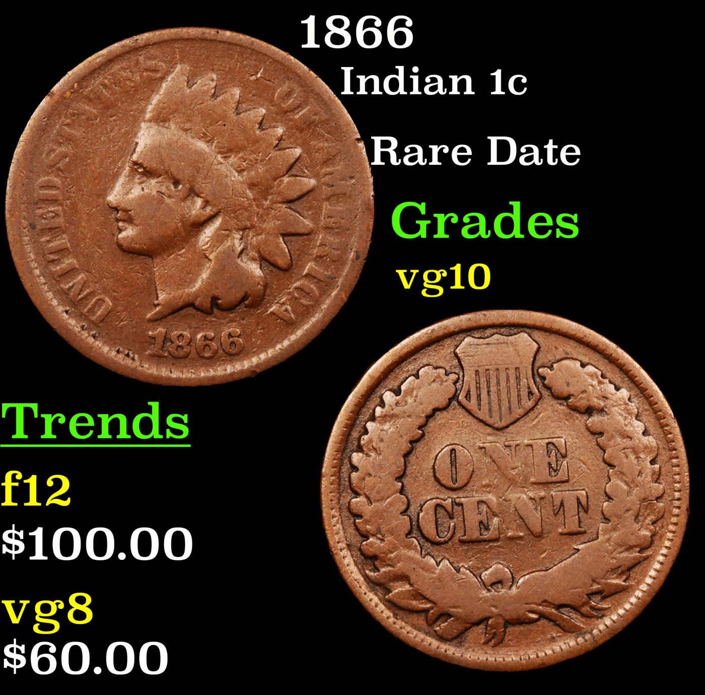 1866 Indian Cent 1c Grades vg+. According to David Hall from PCGS, 'The 1866, 1867, and 1868 Indian cents are of approximate equal rarity. All three are definitely rarer than the 1864 and 1865.