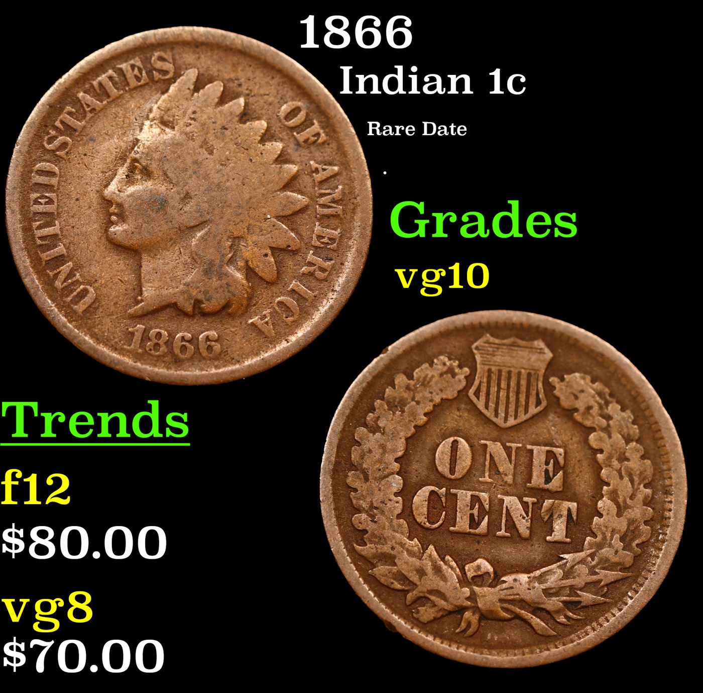 1866 Indian Cent 1c Grades vg+. According to David Hall from PCGS, 'The 1866, 1867, and 1868 Indian cents are of approximate equal rarity. All three are definitely rarer than the 1864 and 1865.