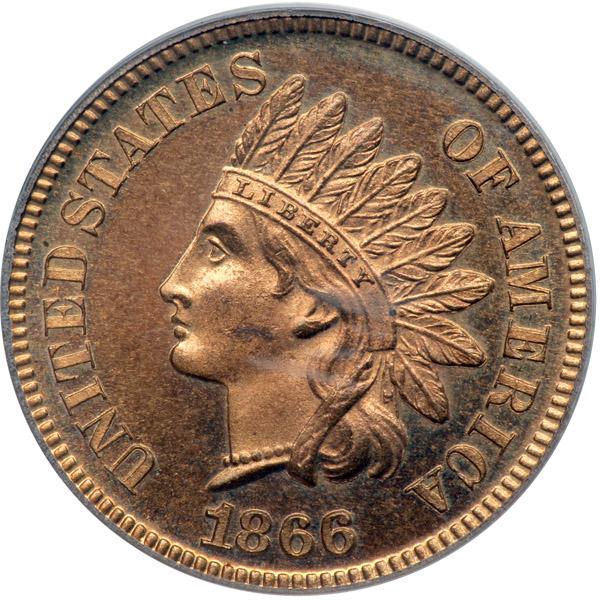 1866. PCGS graded Proof 65 Red. A brilliant mint red gem that is resplendent in every way; devices show needle-point detail on even the tiniest design elements such as the feather ends and diamond pattern on the ribbon. Only 725 or so Proofs struck. Pop 14; 3 in 66 RD (PCGS # 2287) .