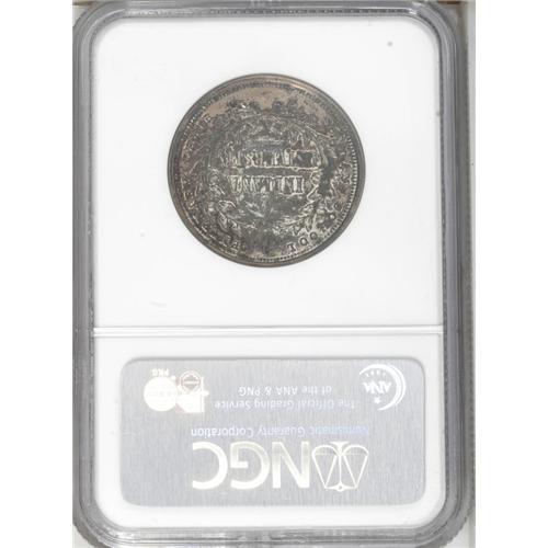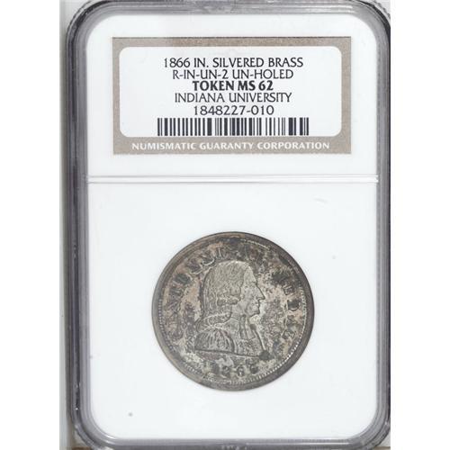 <B>(1866) Indiana University Trade Token, MS62 NGC.</B></I> Silvered brass, 30mm, unholed, plain edge, Rulau IN-Un 2. Obverse: male bust in clerical attire facing right; Centennial Medal, above, 1866, below. Reverse: Indiana / University within wreath. Outside wreath: Sunday School Centenary Chair. An unholed version of a piece that was issued holed. Moderate patina that thickens around the lettering.