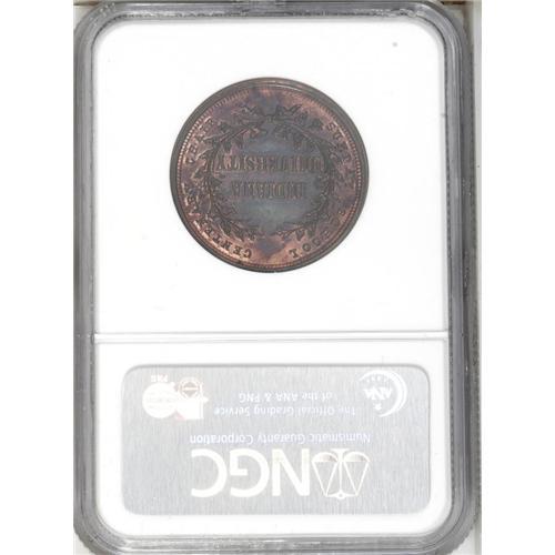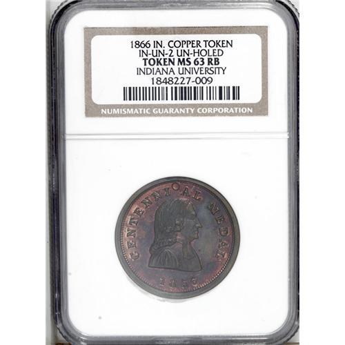 <B>(1866) Indiana University Token, In-Un-2, MS63 Red and Brown NGC.</B></I> Copper, 30mm, unholed, plain edge. Obverse: male bust in clerical attire facing right; Centennial Medal, above, 1866, below. Reverse: Indiana / University / within wreath. Outside wreath: Sunday School Centenary Chair. This is an unholed version of a piece that was issued holed. Also Rulau's example has the word Asbury between Indiana and University; this piece does not. Lovely auburn patina near the center of both sides; edges are still reflective and clean.