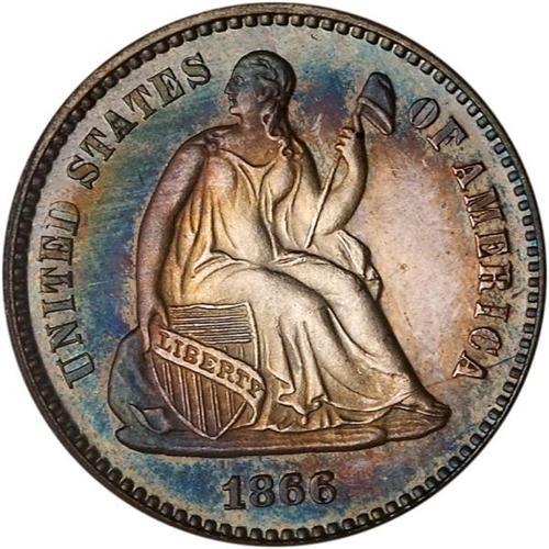 <b>1866 Liberty Seated Half Dime. PCGS graded PF64 CAM.</b> Only 725 Proofs made this year. A beautiful little jewel with frosty relief (white in the center), dazzling fresh mirrors around, and glorious toning at the rims. Just the ticket for someone wanting eye-appeal <b>(PCGS # 84449)</b> <i>